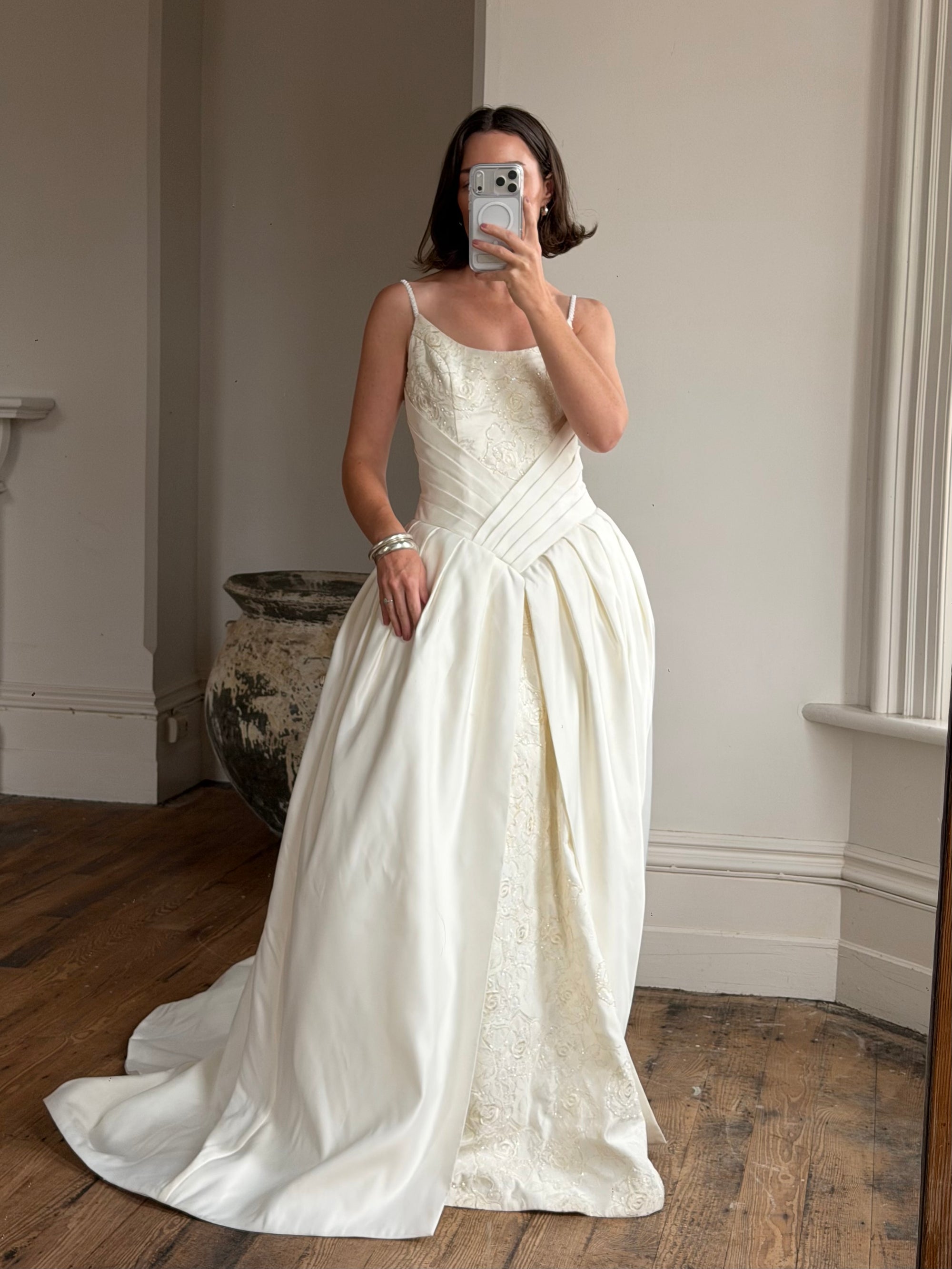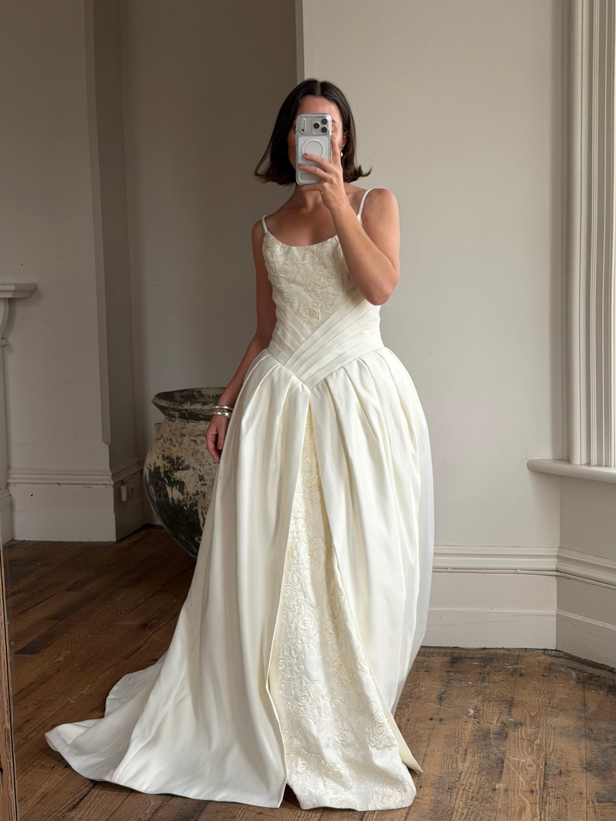 Vintage 90s Pleated Jacquard Satin Wedding Gown