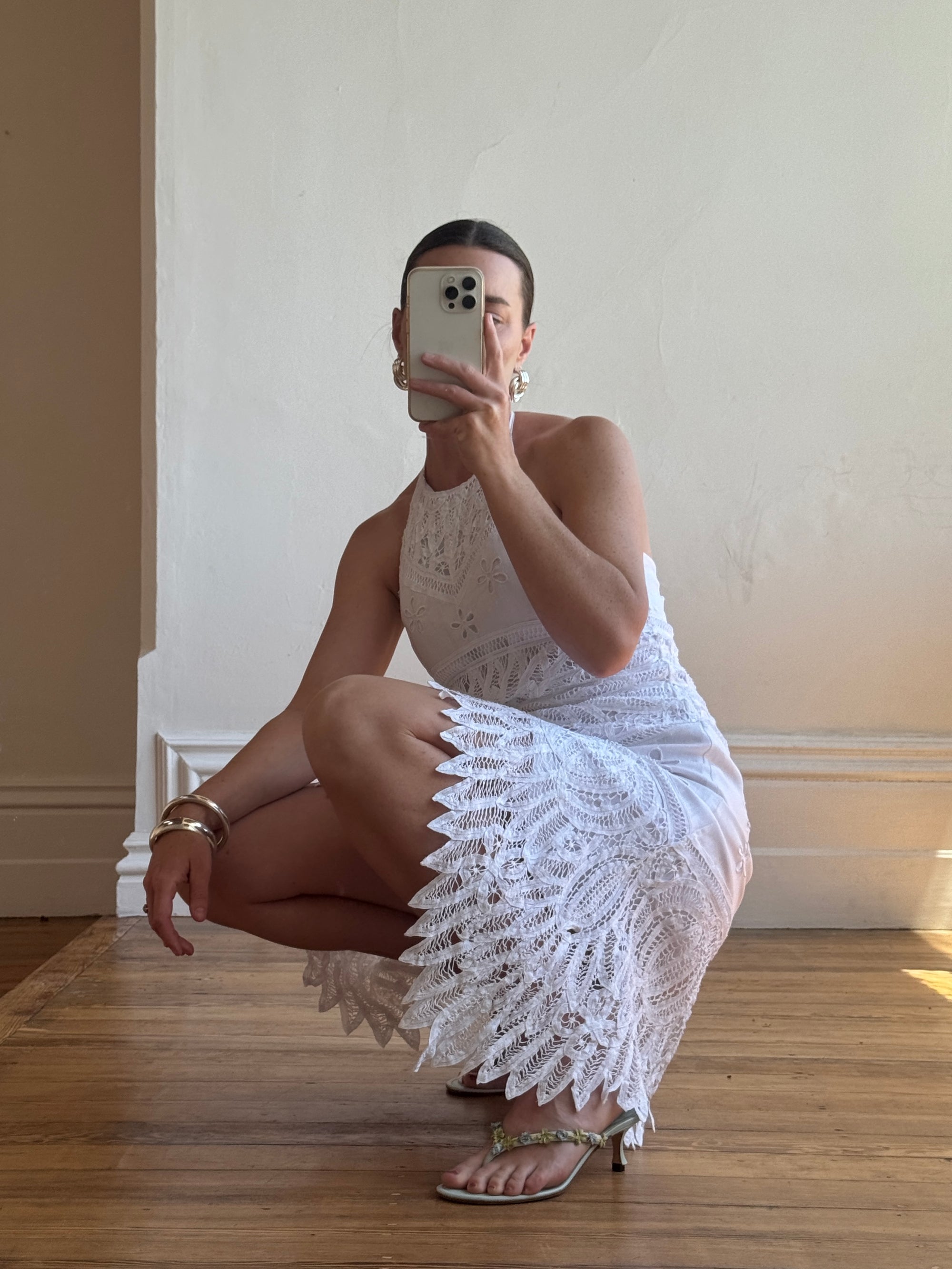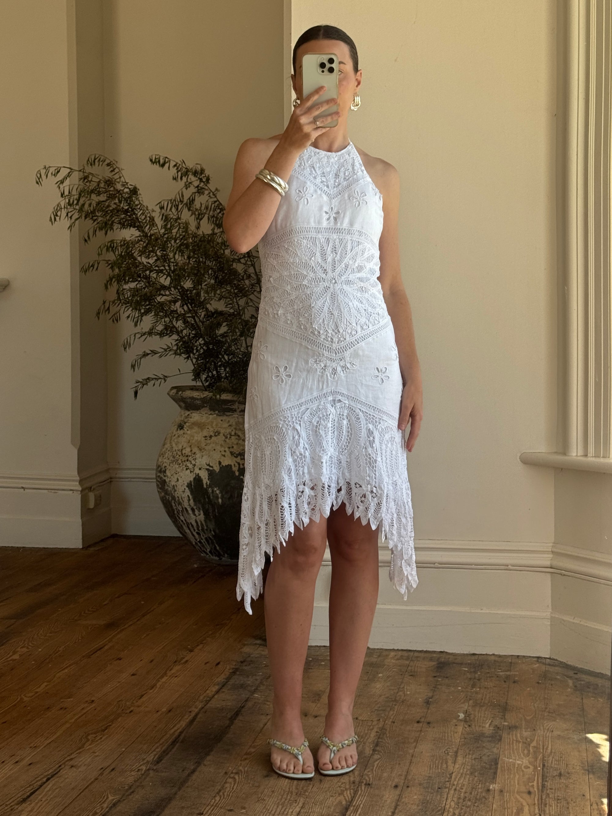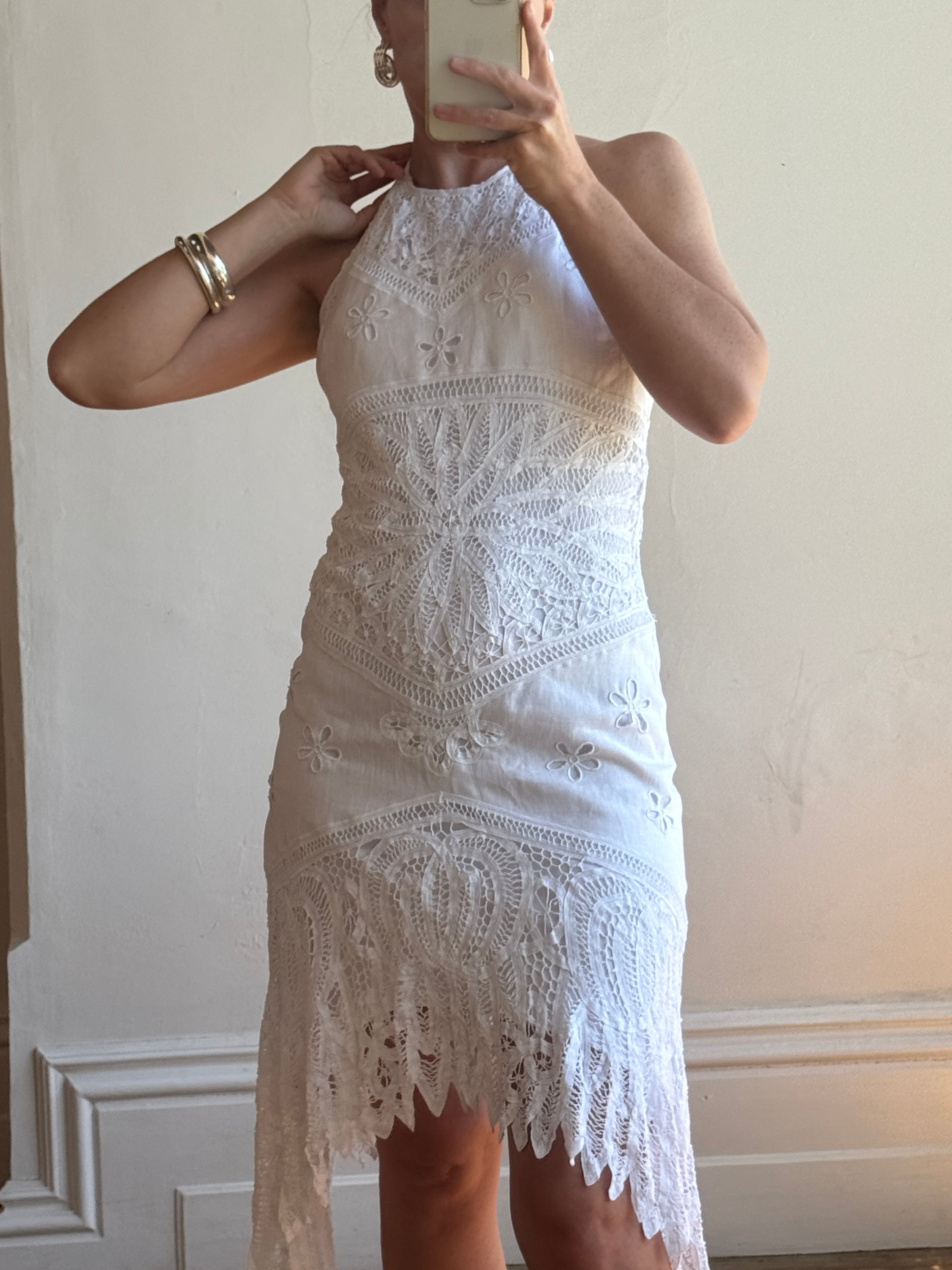 Vintage 90s Crochet Linen Handkerchief Halter Dress