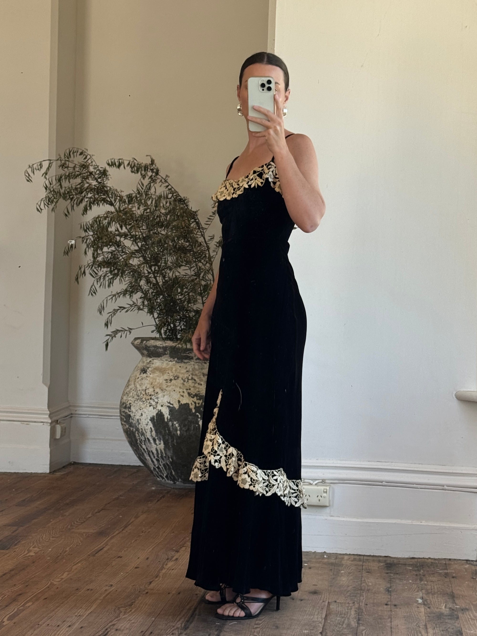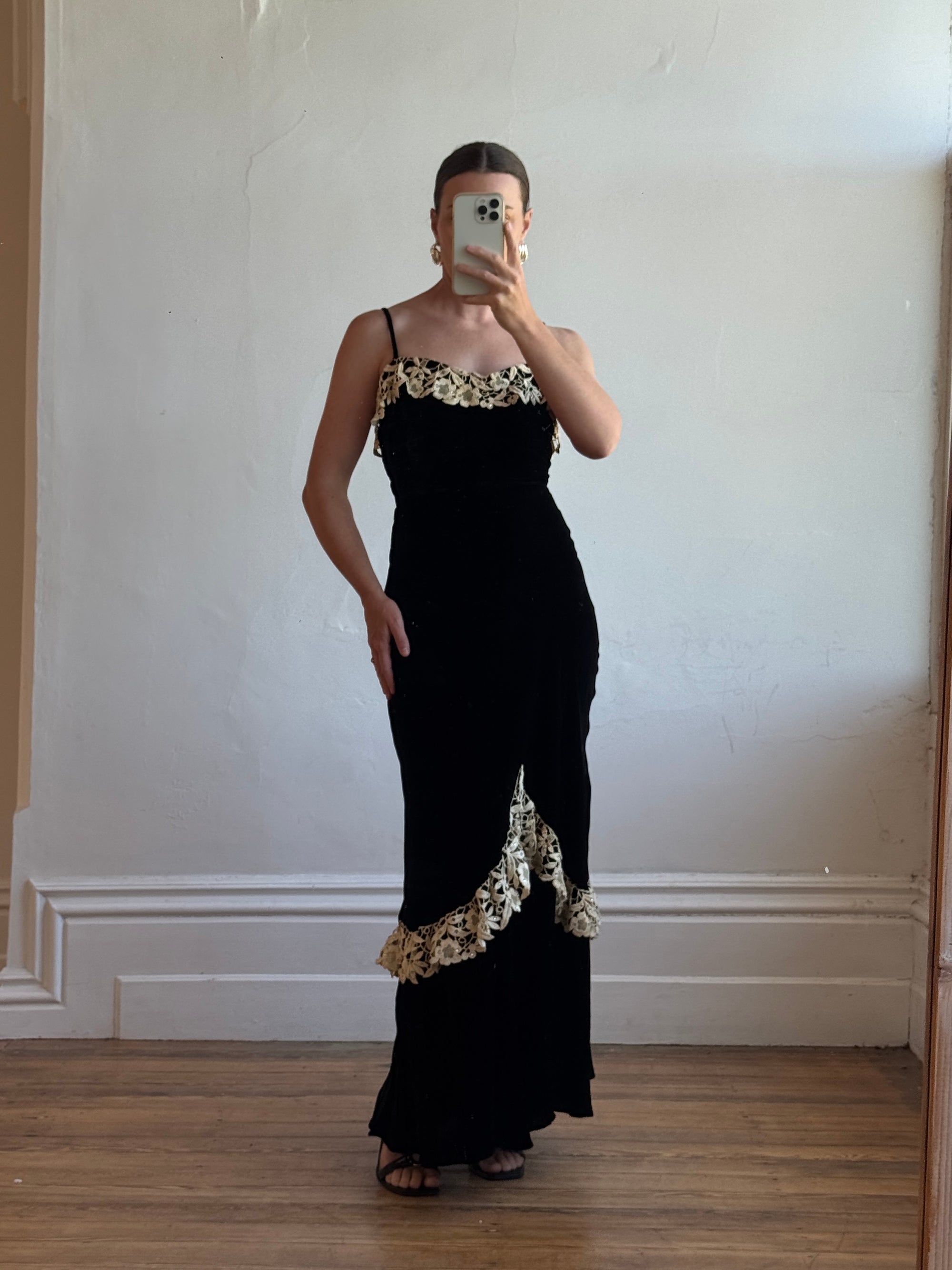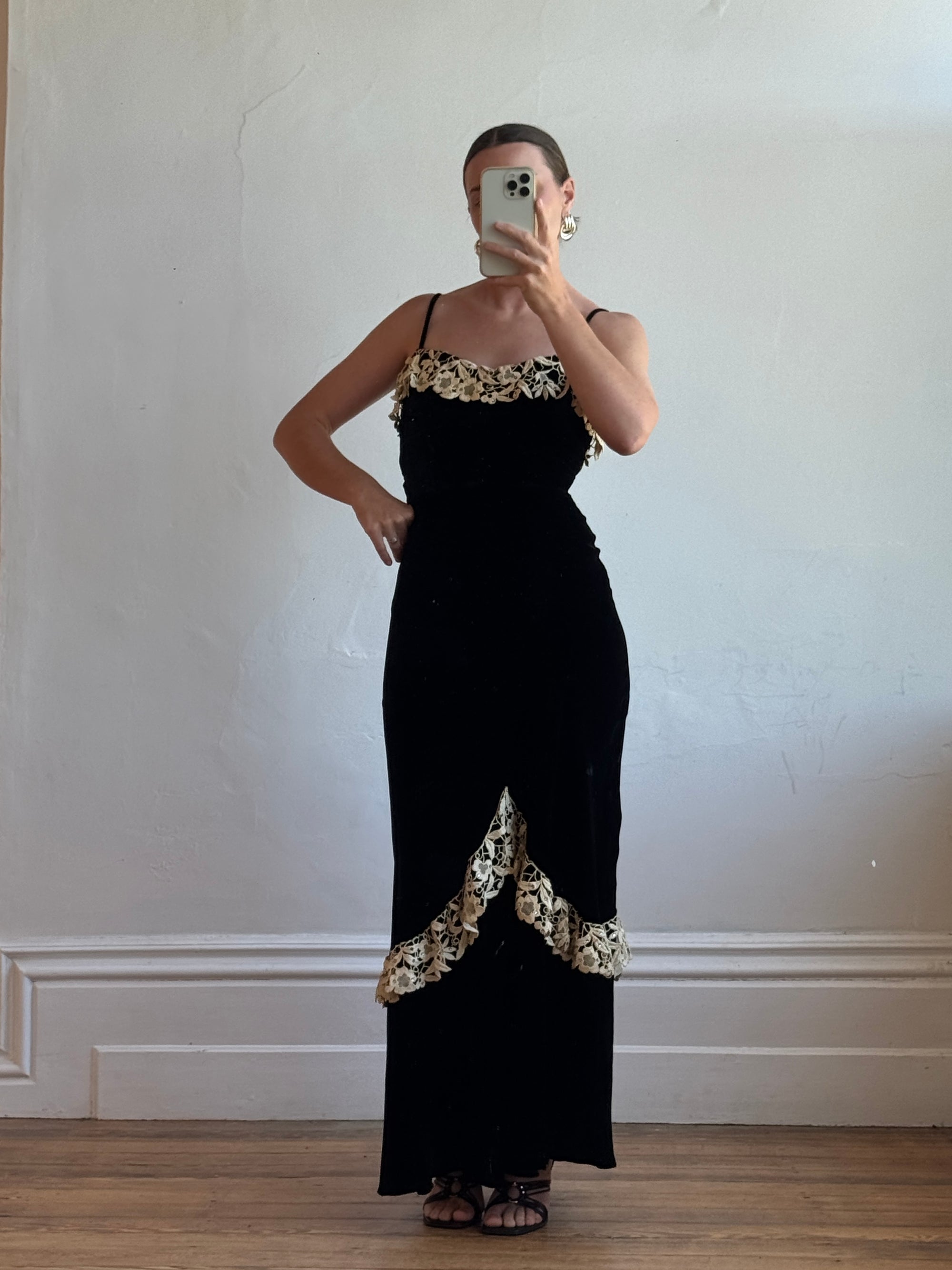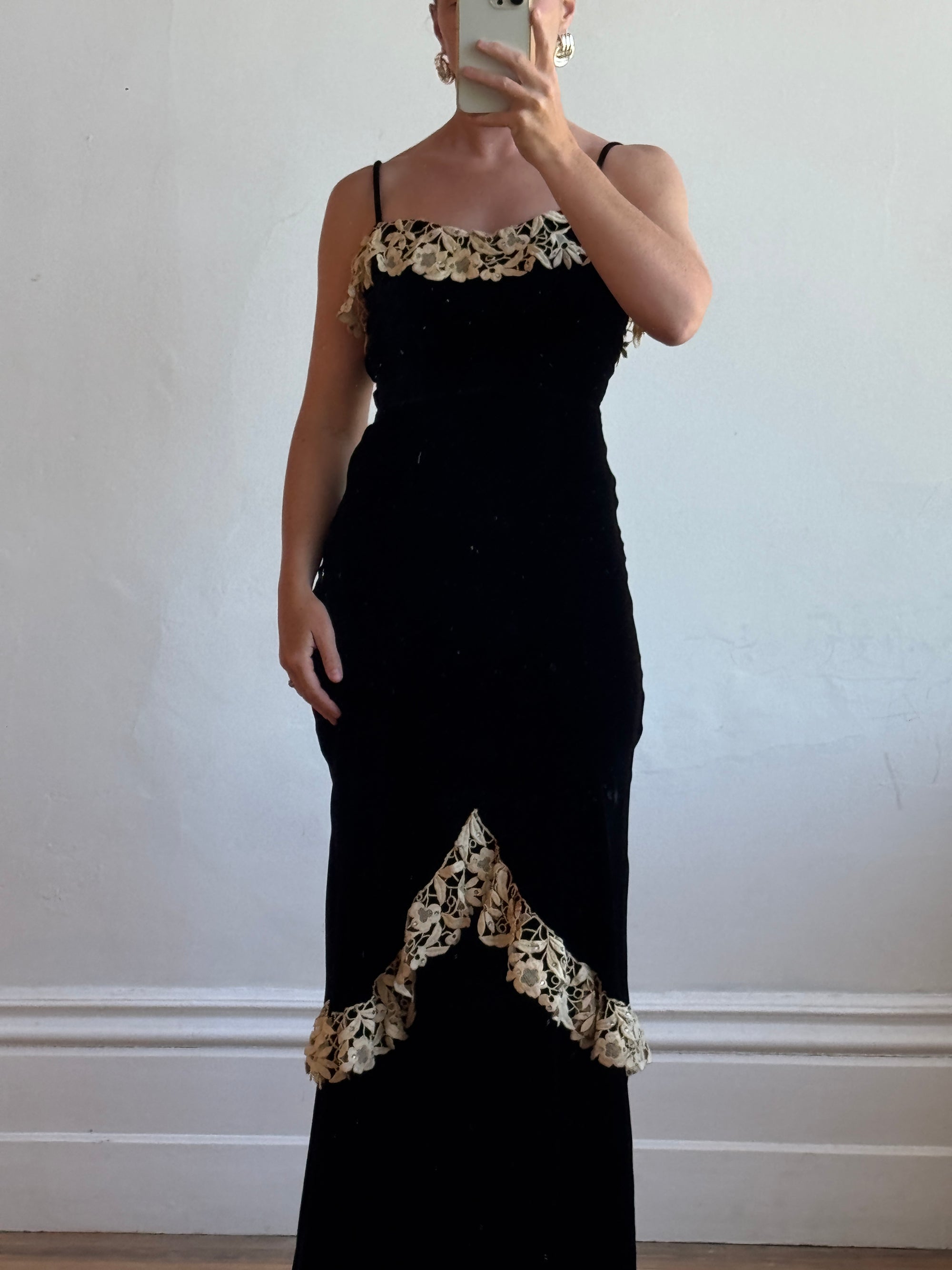 Vintage 40s Velvet Bias Strappy Dress with Lace Trim Noir