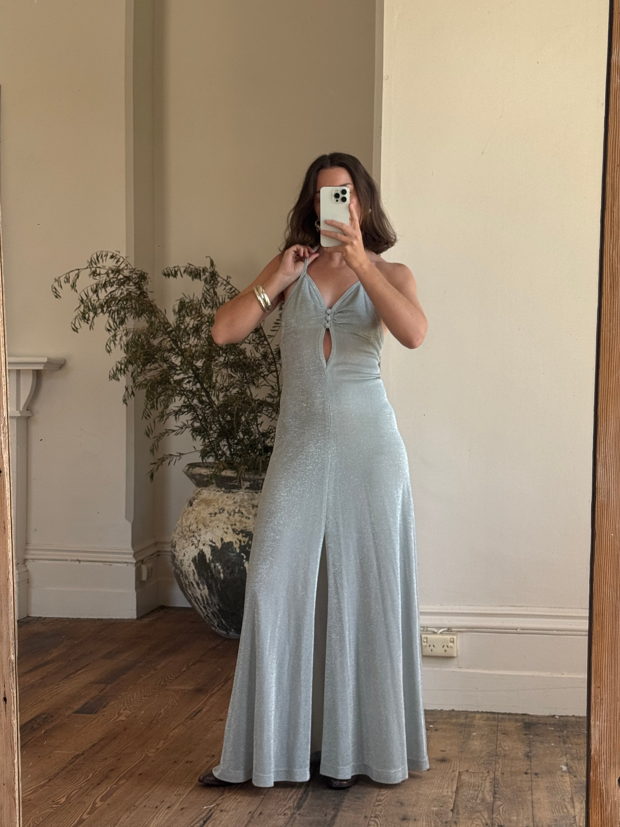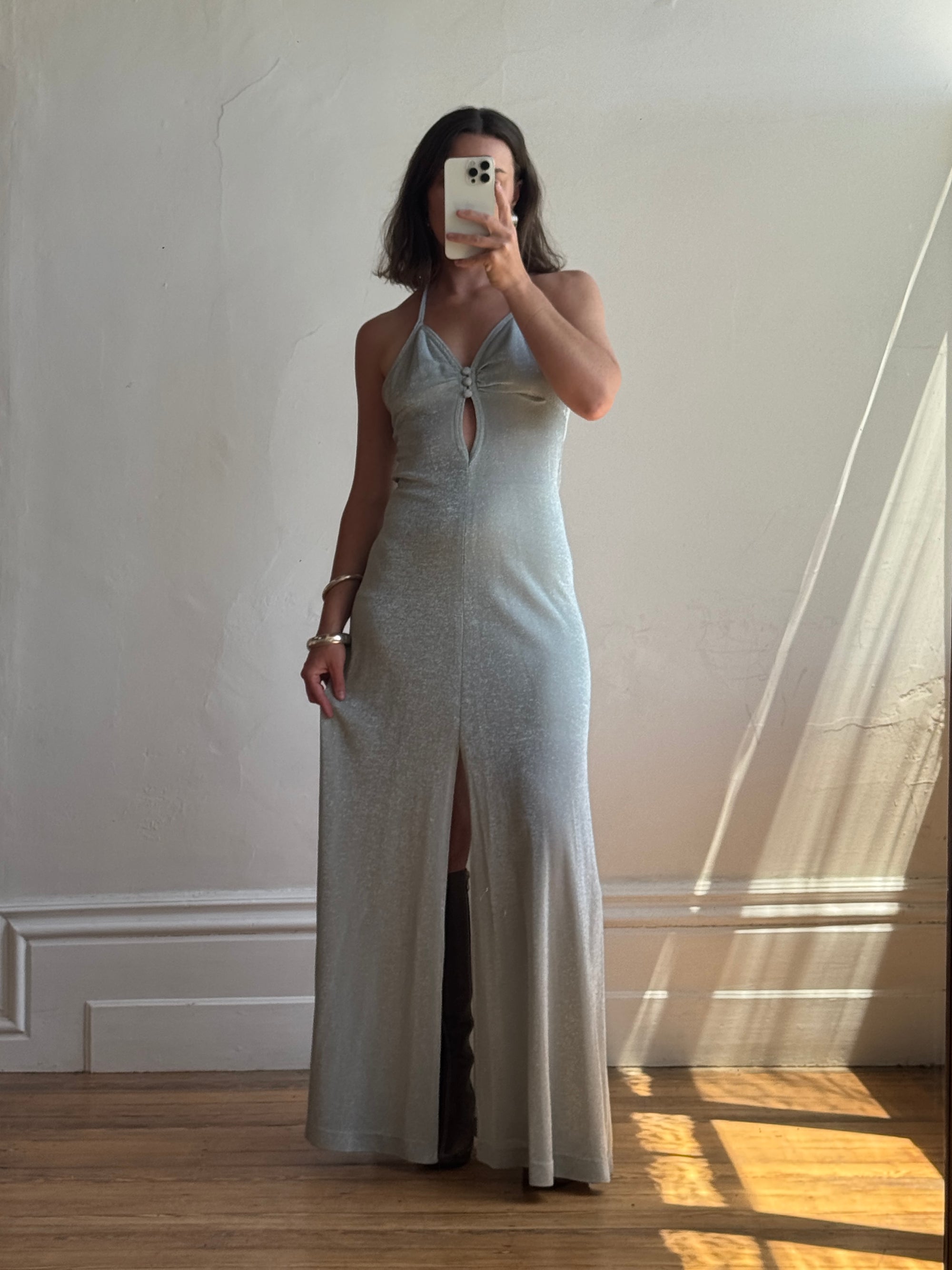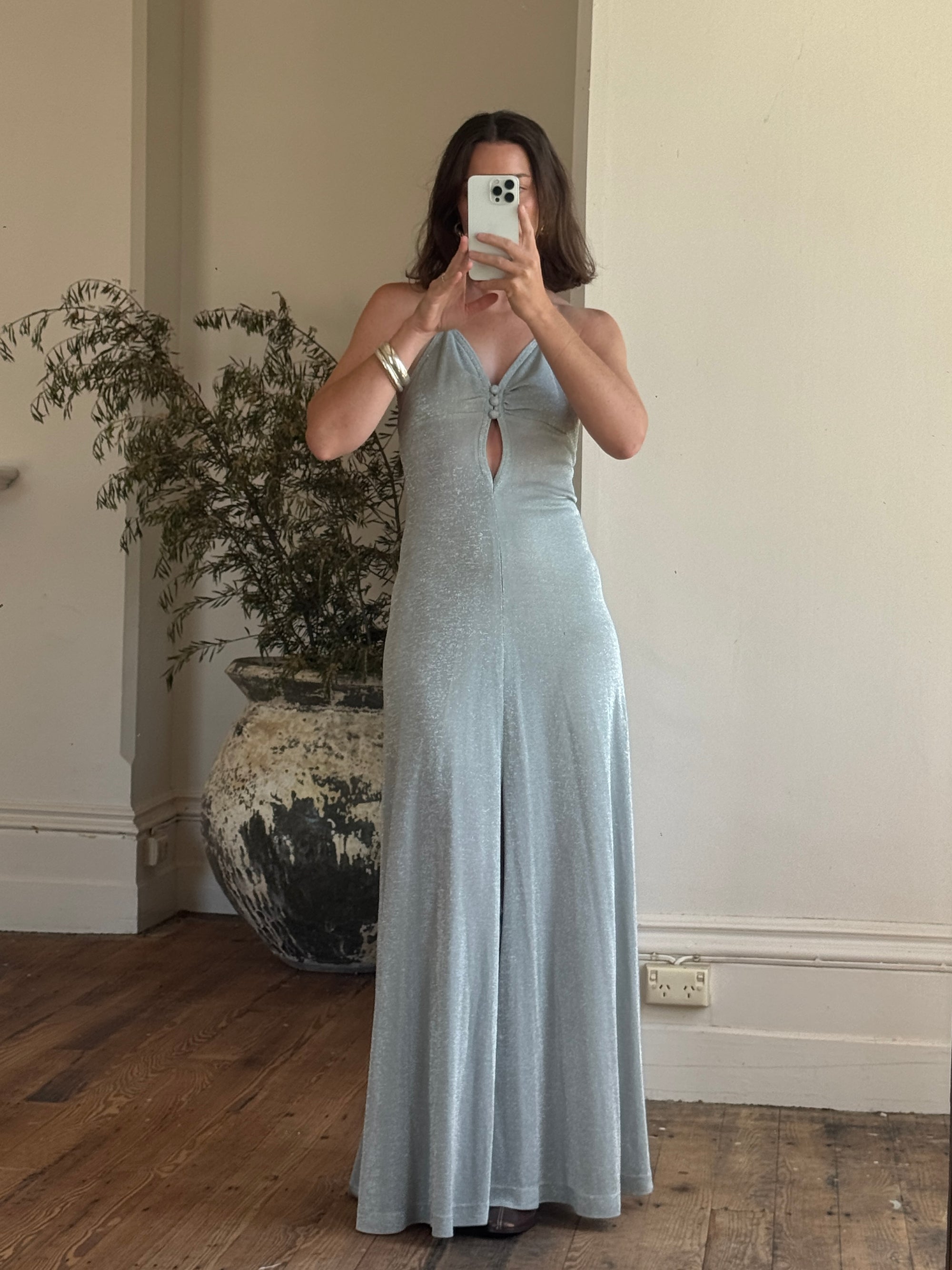 Vintage 70s Lurex Ice Blue Halter Maxi Dress
