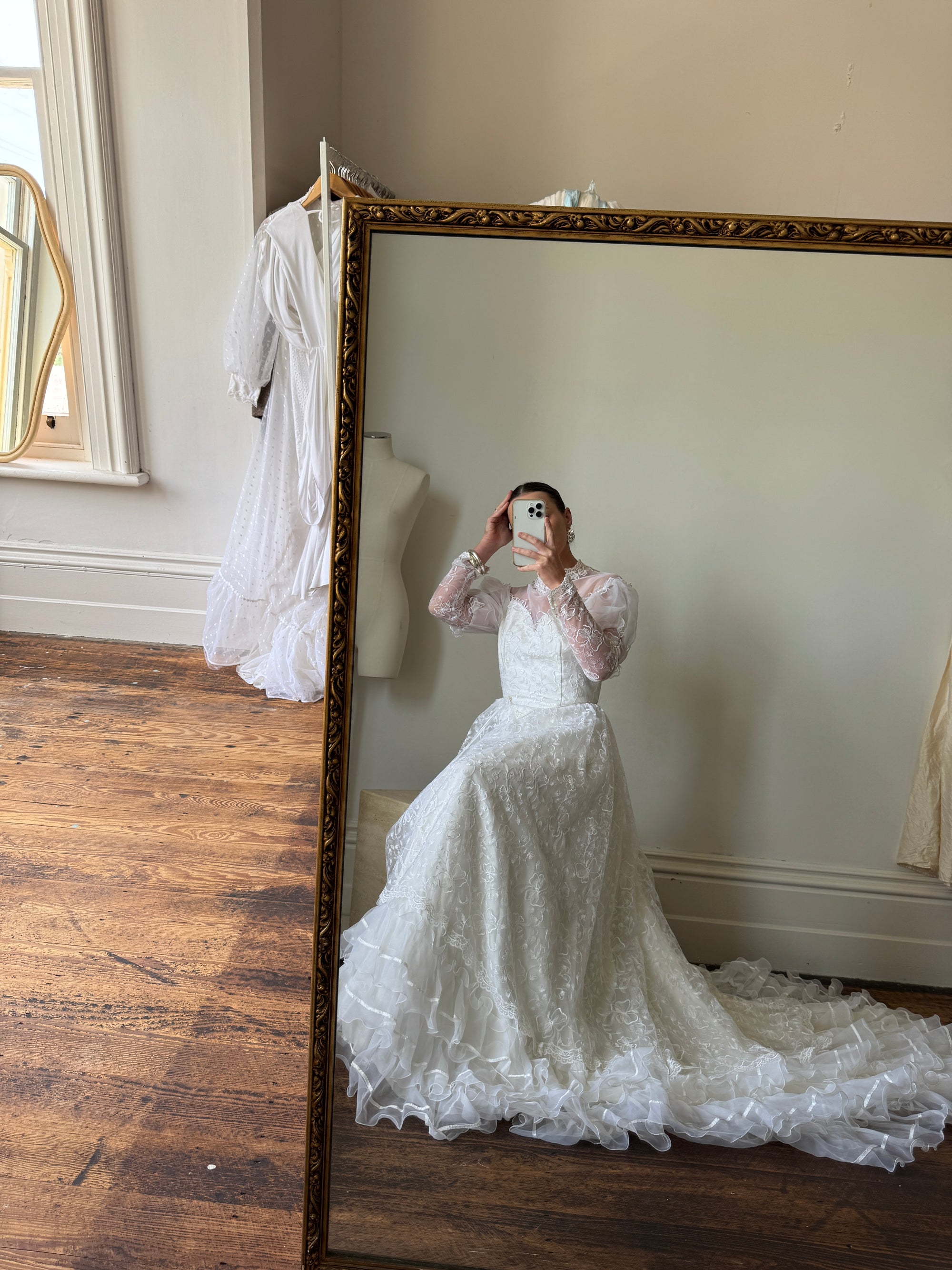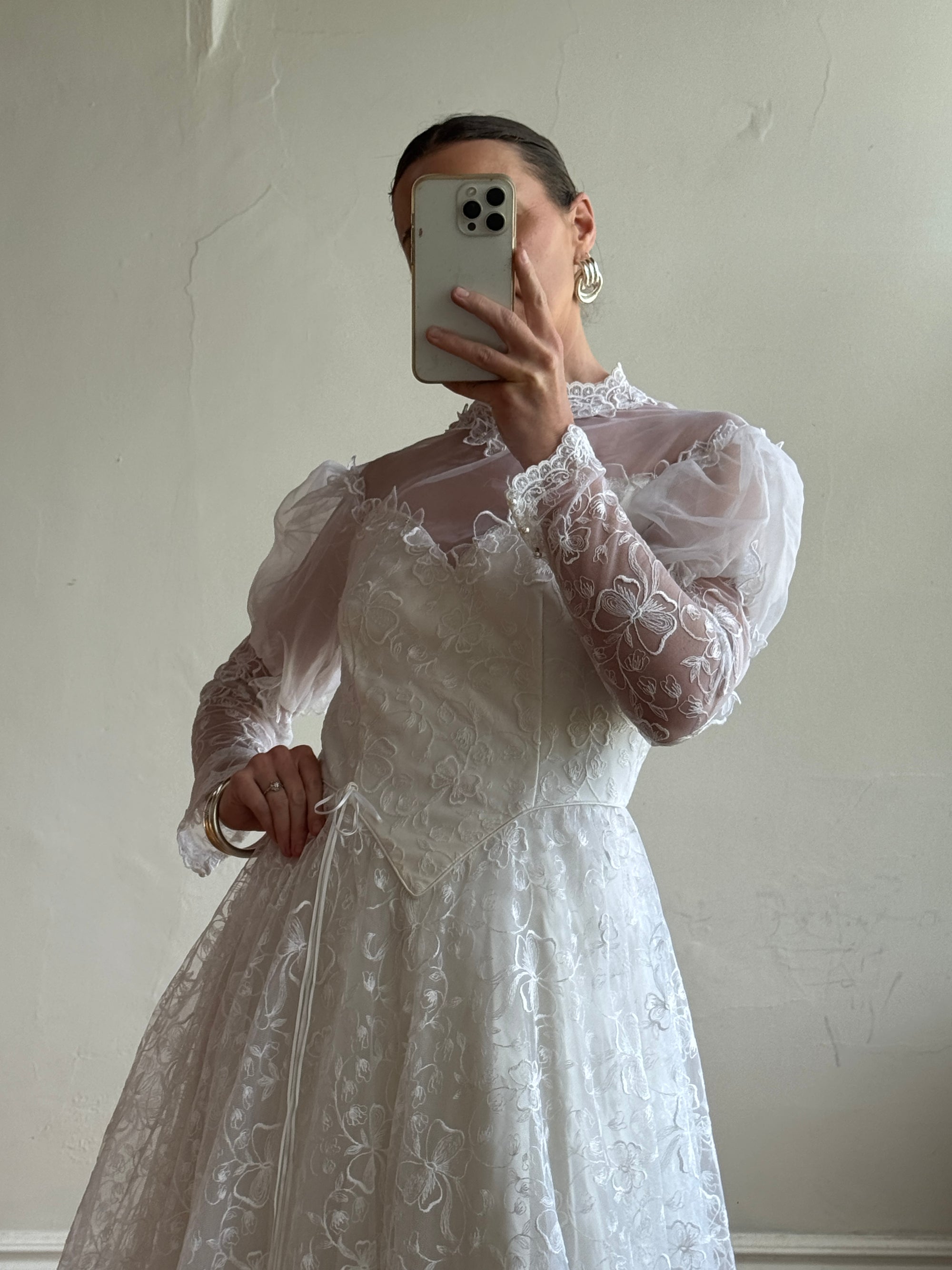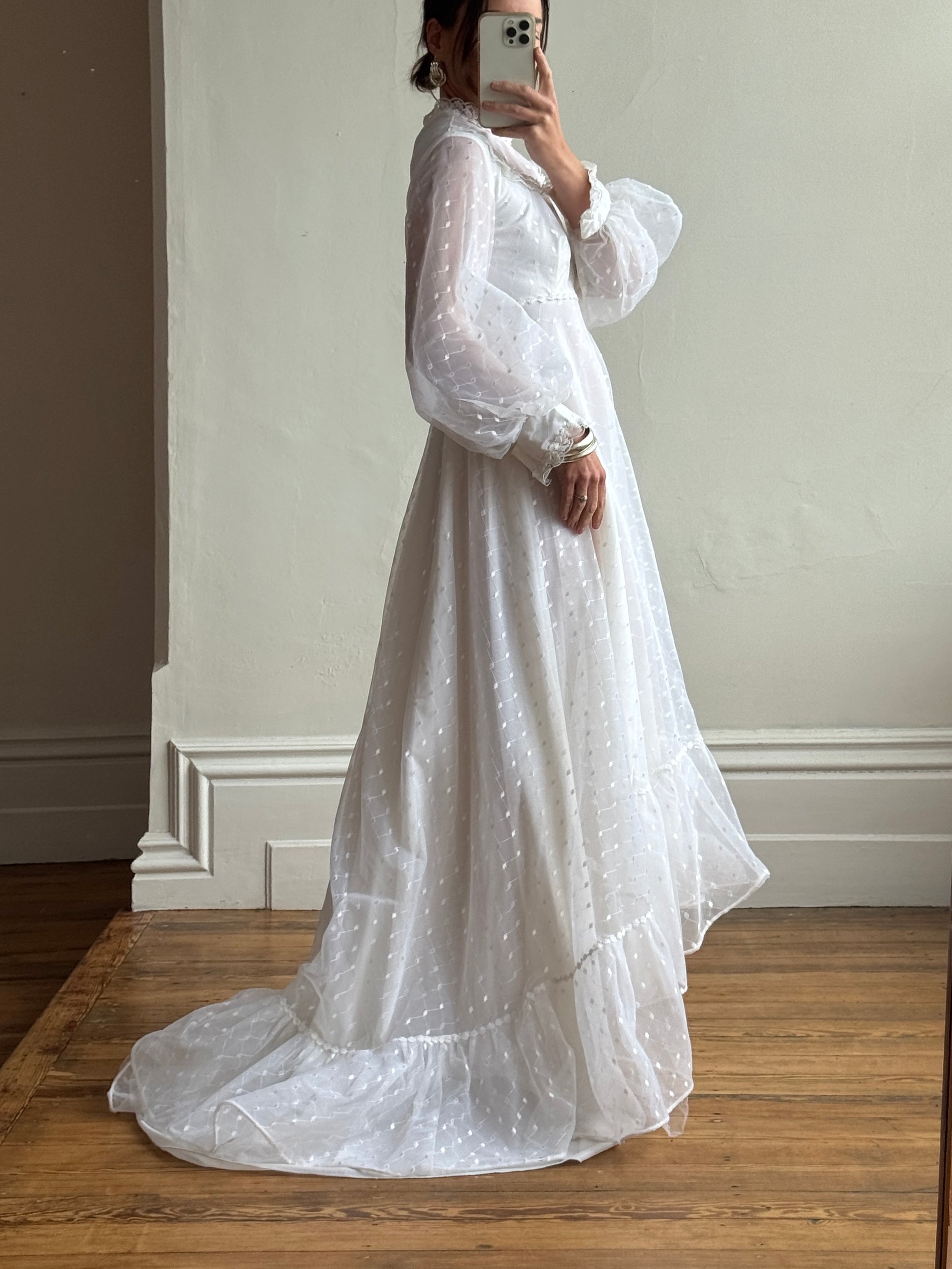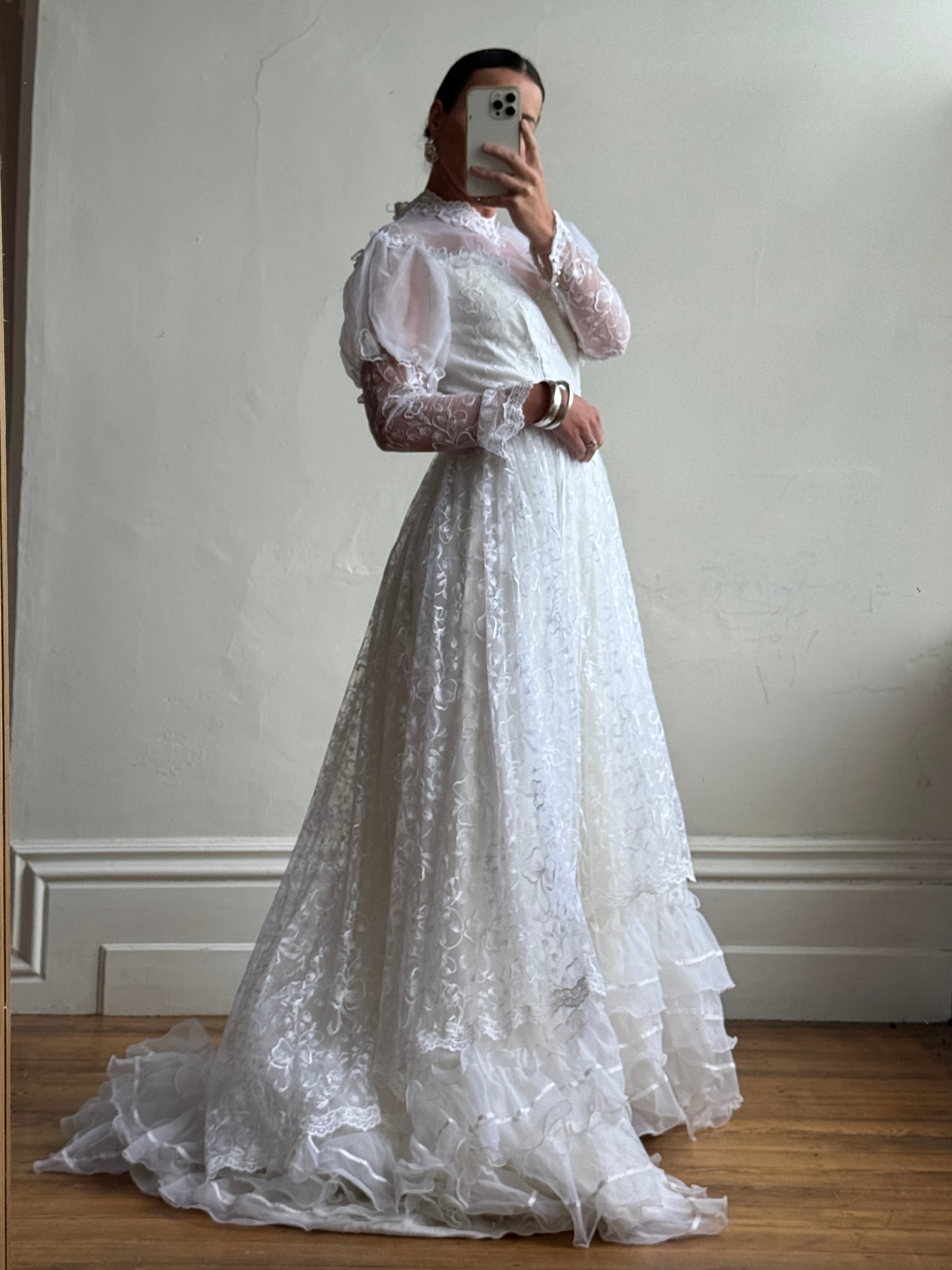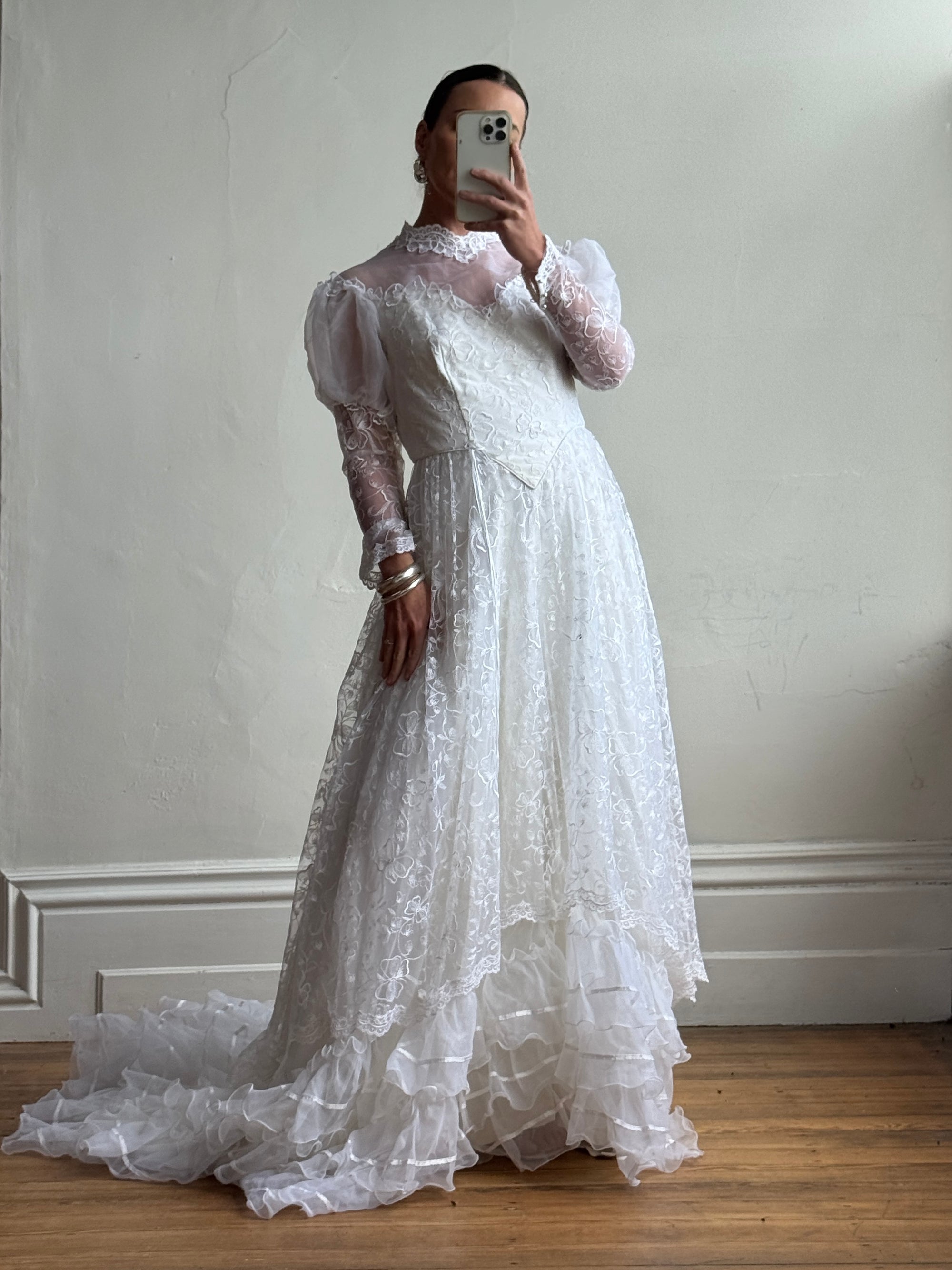Vintage 70s Puff Sleeve Organza Ruffle Wedding Gown