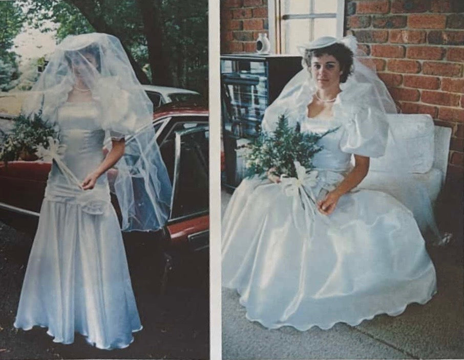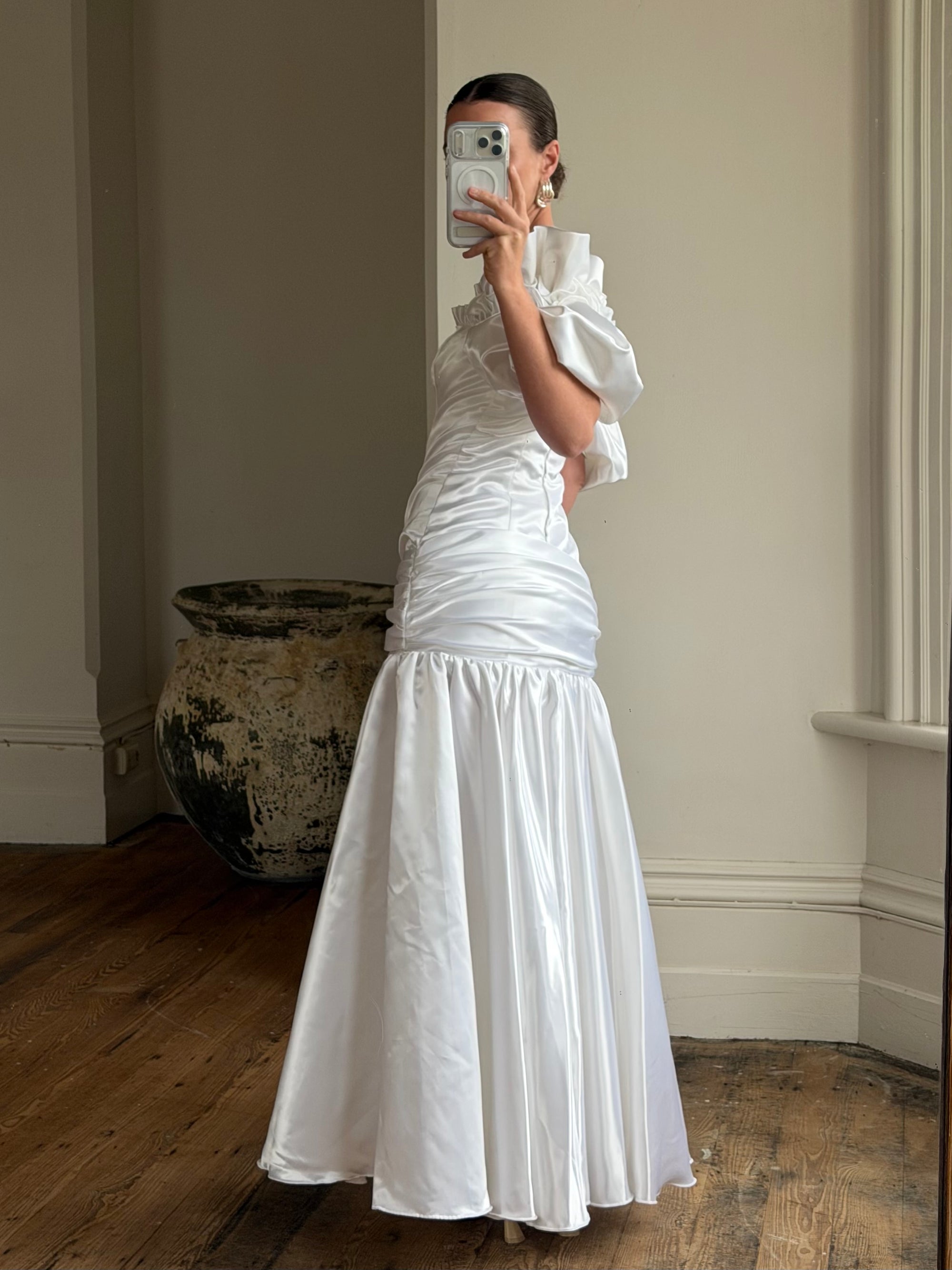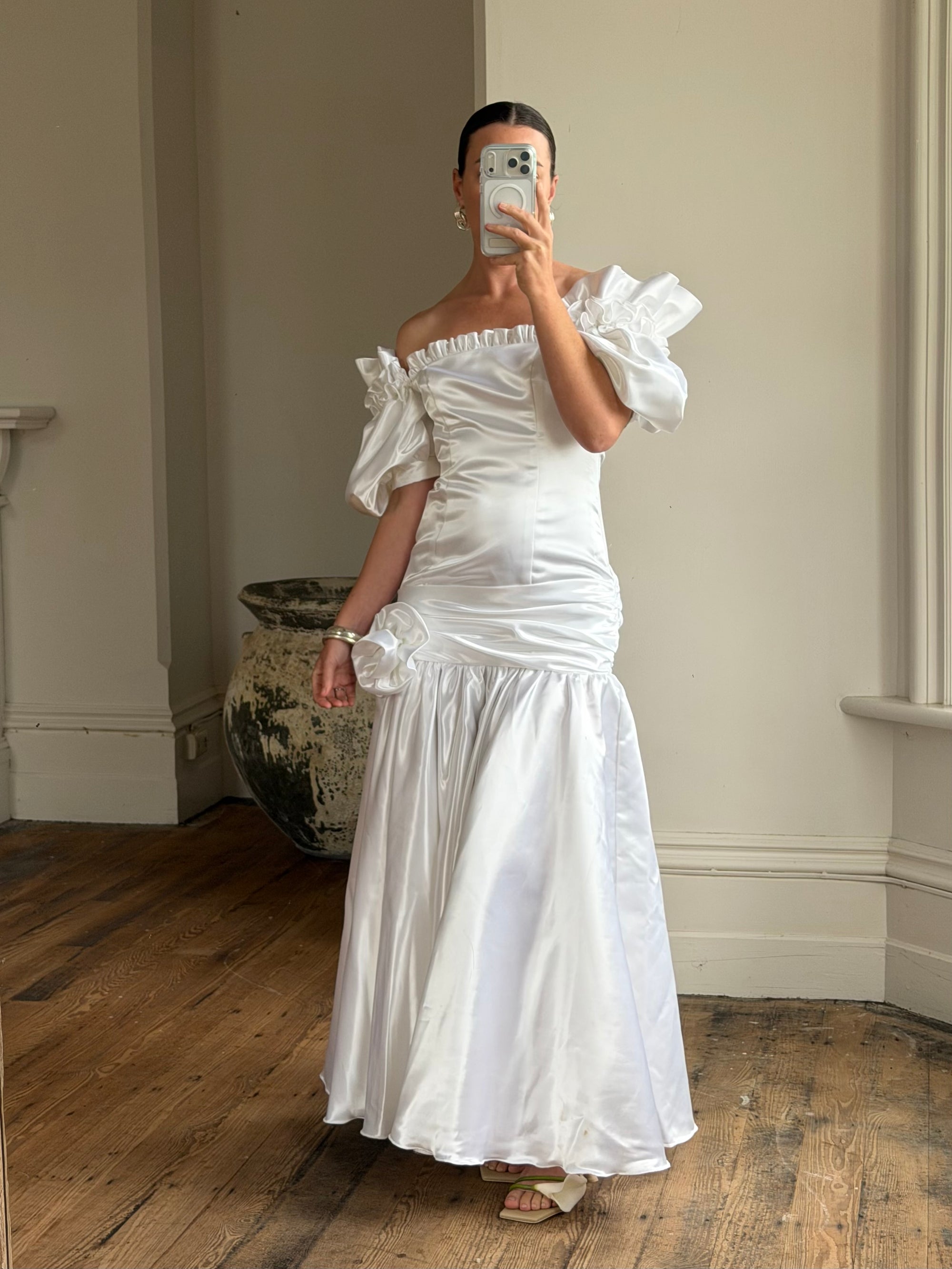 Vintage 80s Satin Drop Waist Wedding Gown