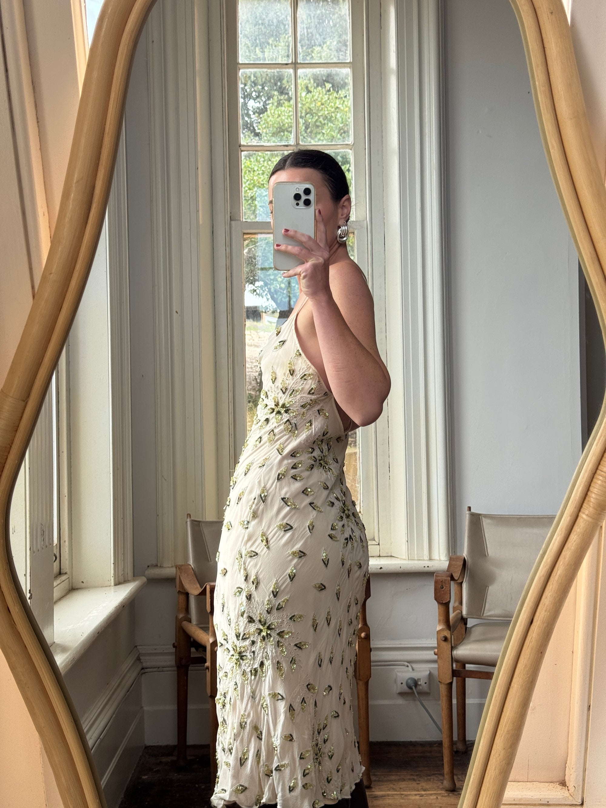 Vintage 90s Pure Silk Beaded Bridal Halter Midi Dress