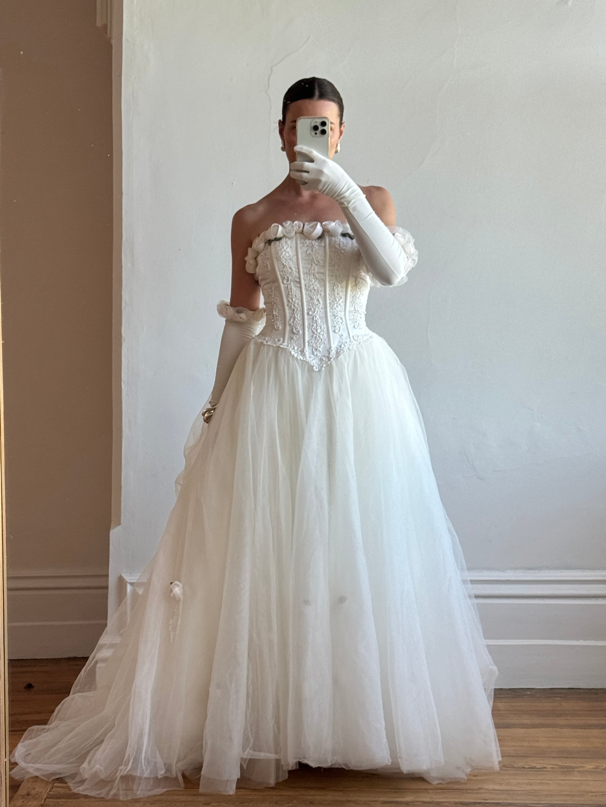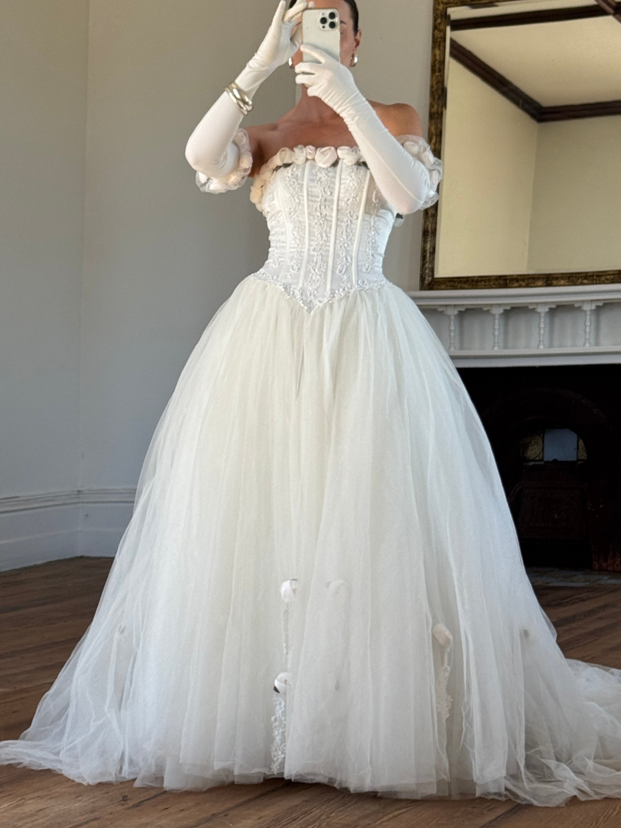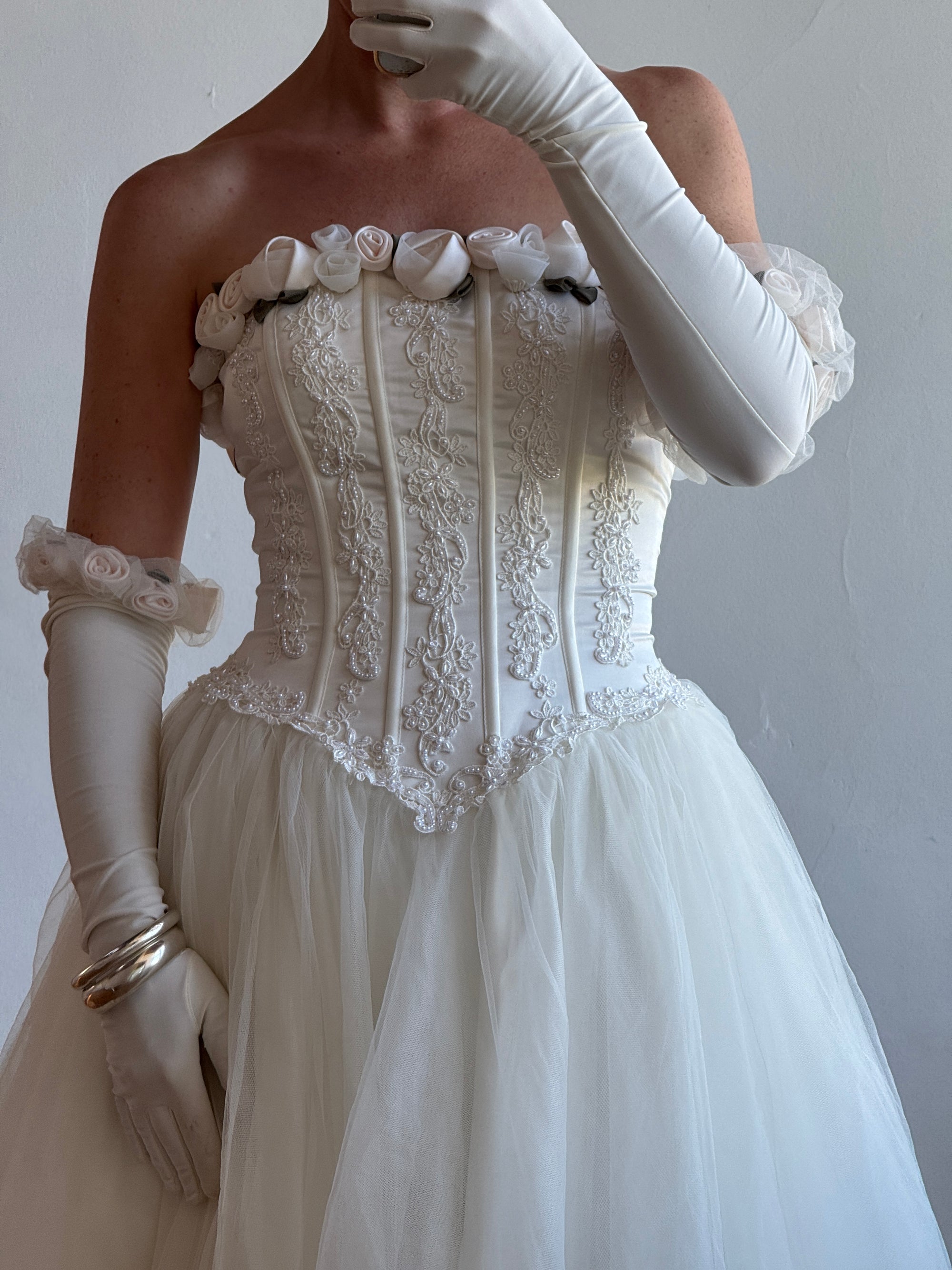 Vintage 90s Rosette Tulle Princess Wedding Gown with Gloves