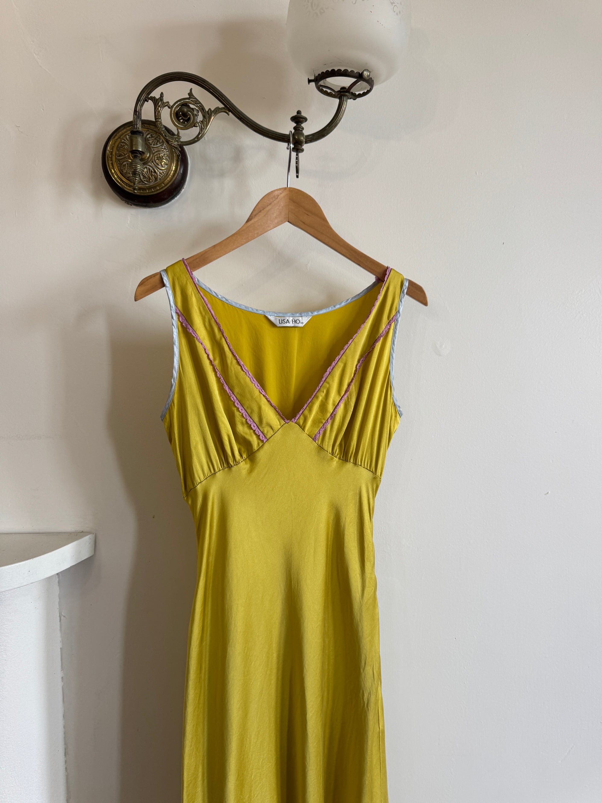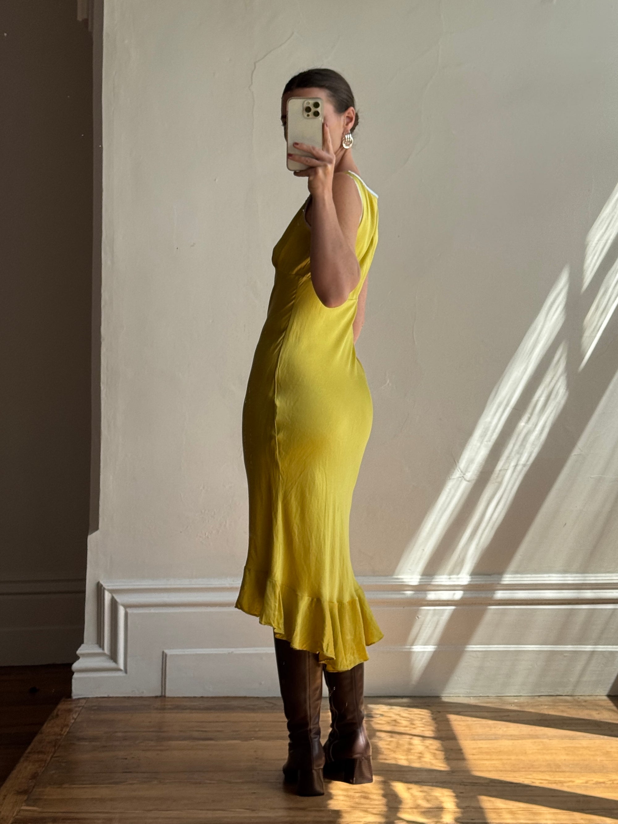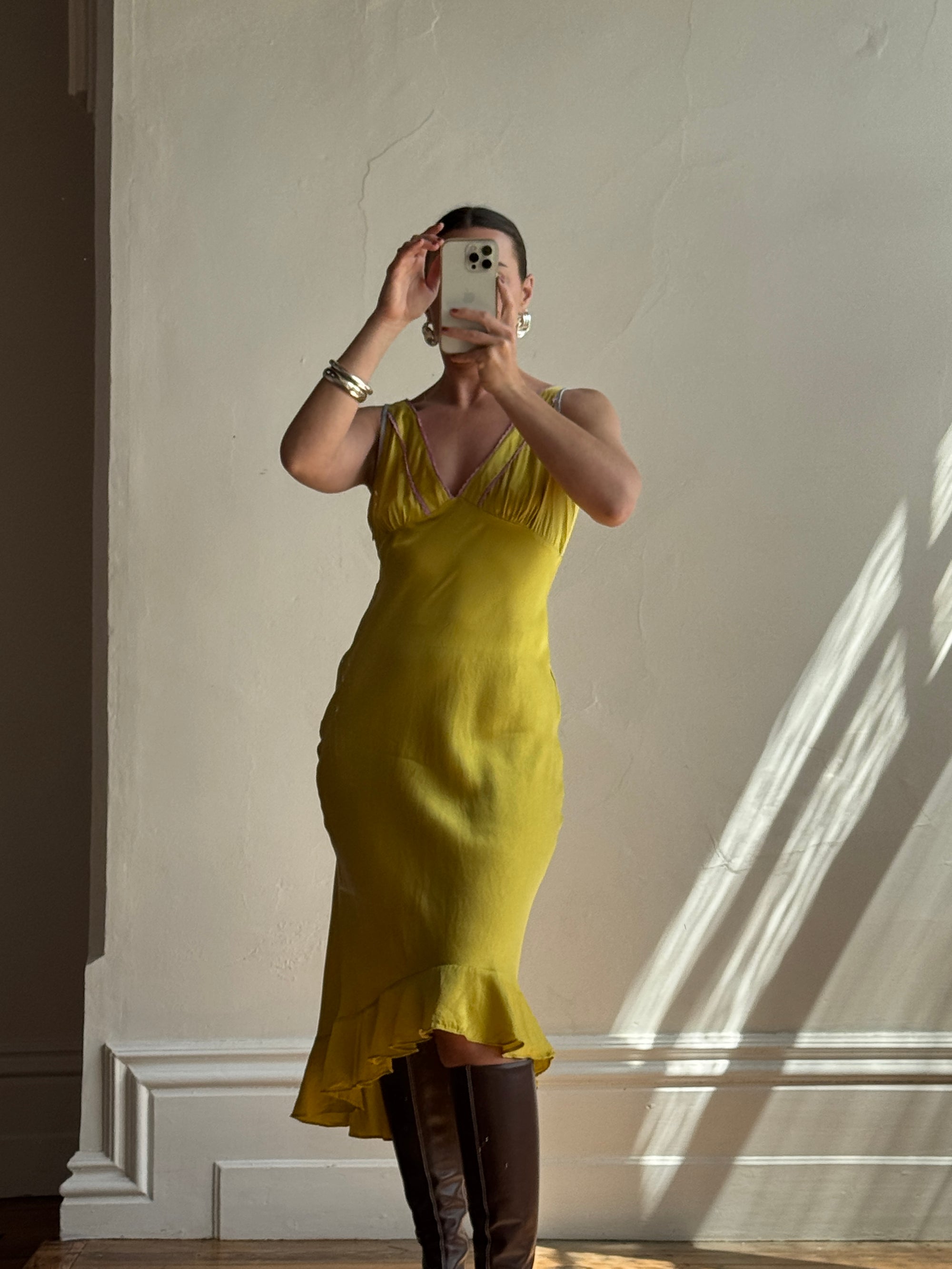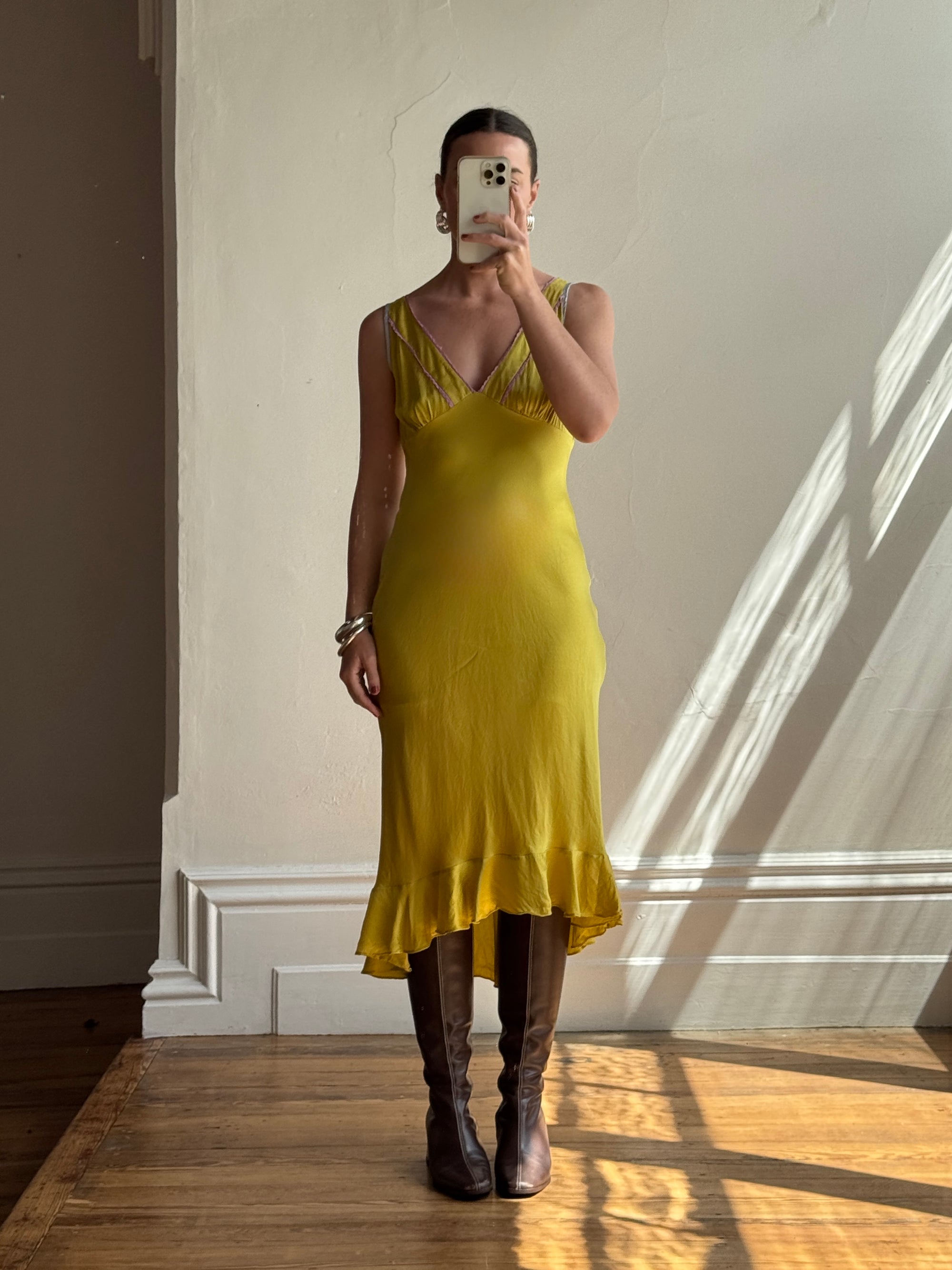 Vintage 90s Pure Silk Bias Midi Dress Chartreuse Multi