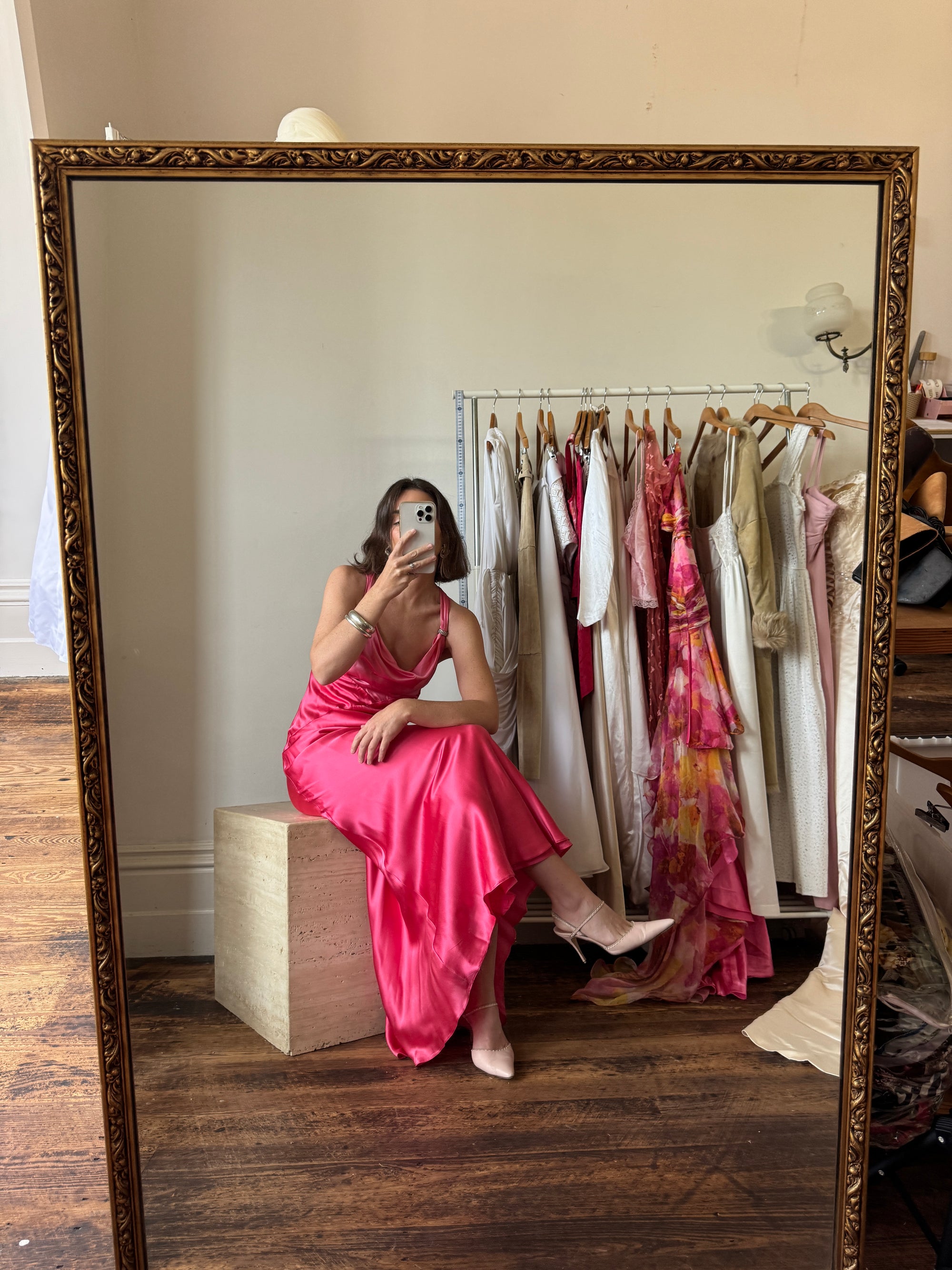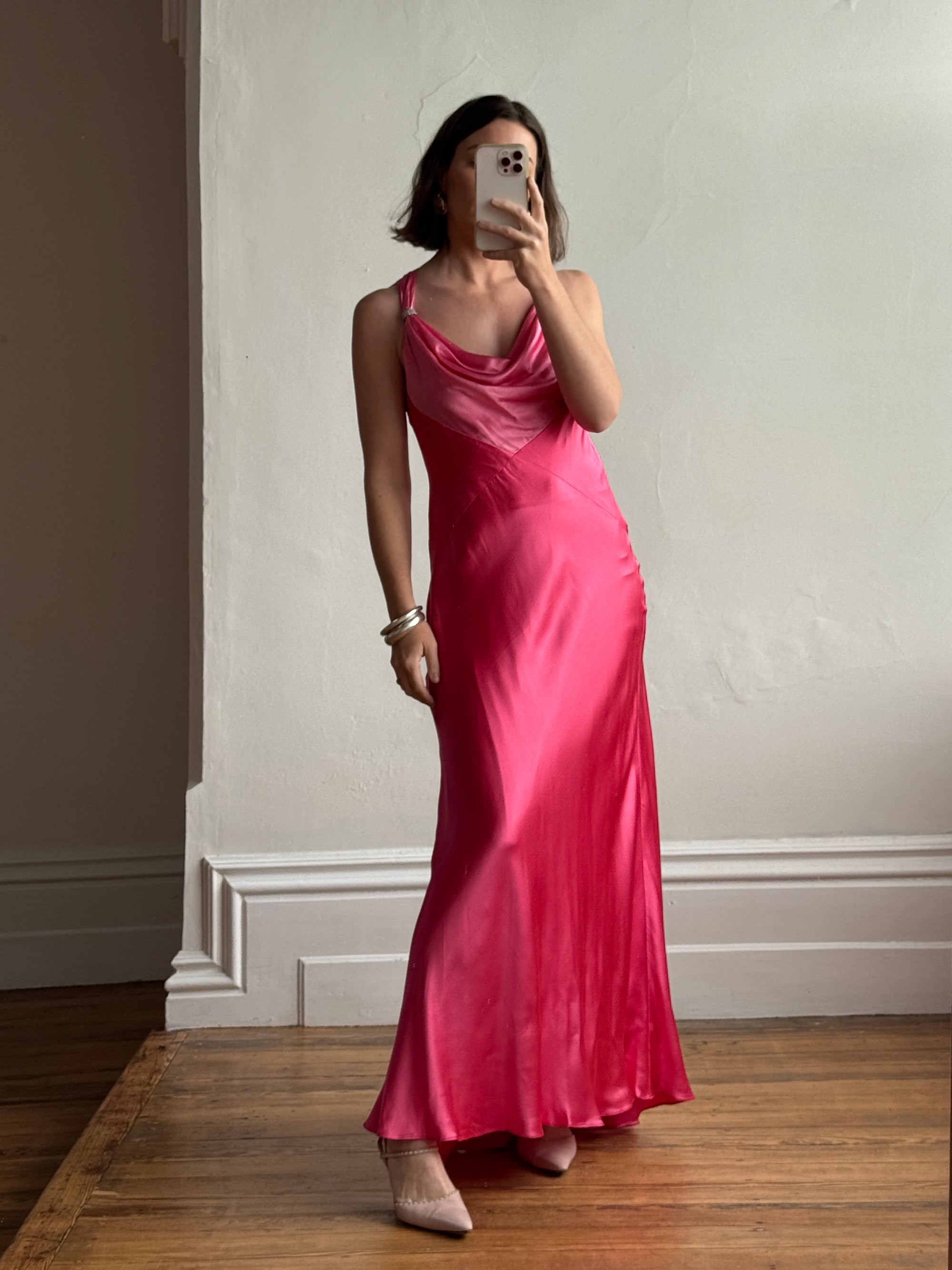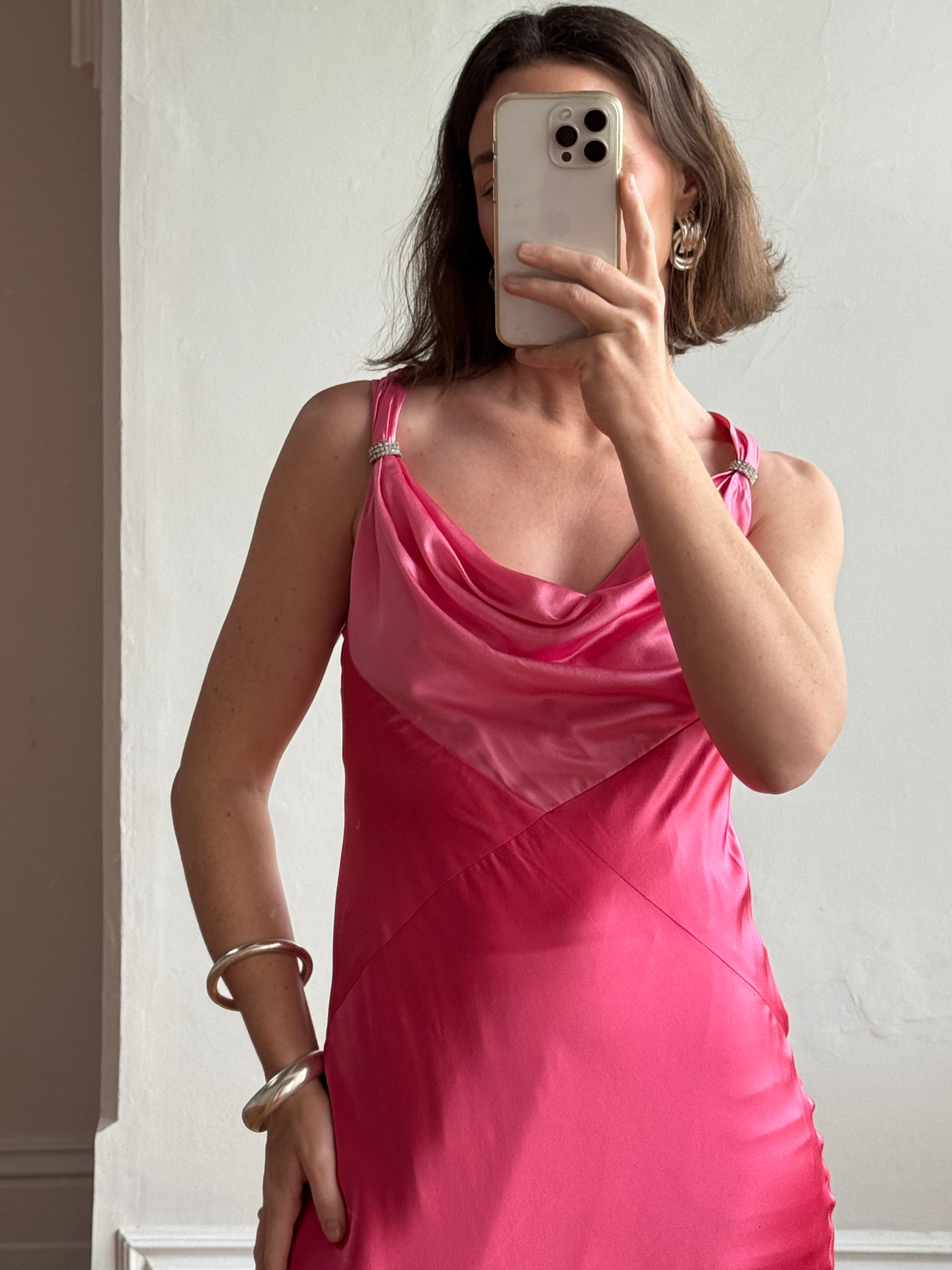 Vintage 90s Pure Silk Bias Cut Slip Dress With Rhinestones Hot Pink