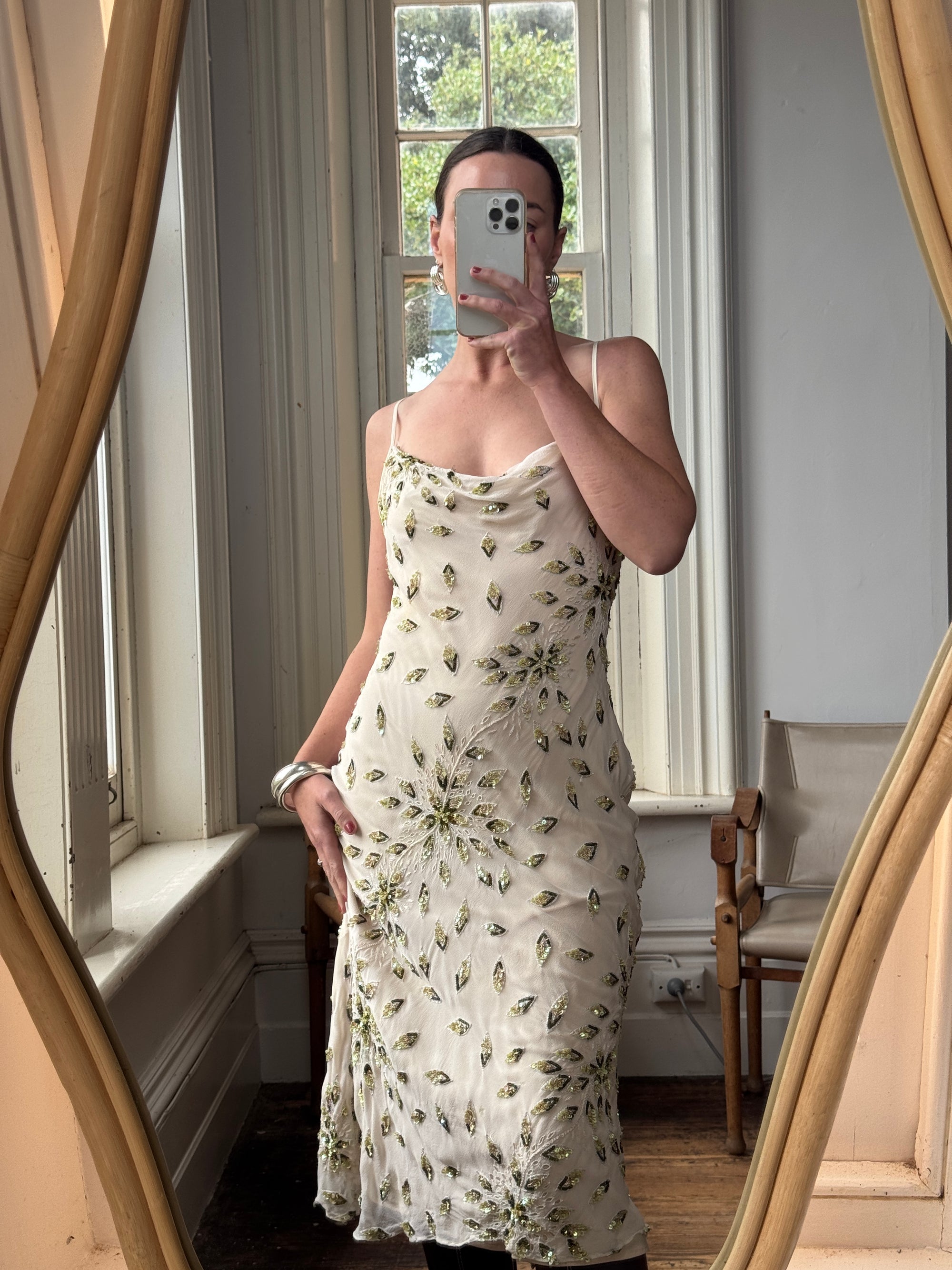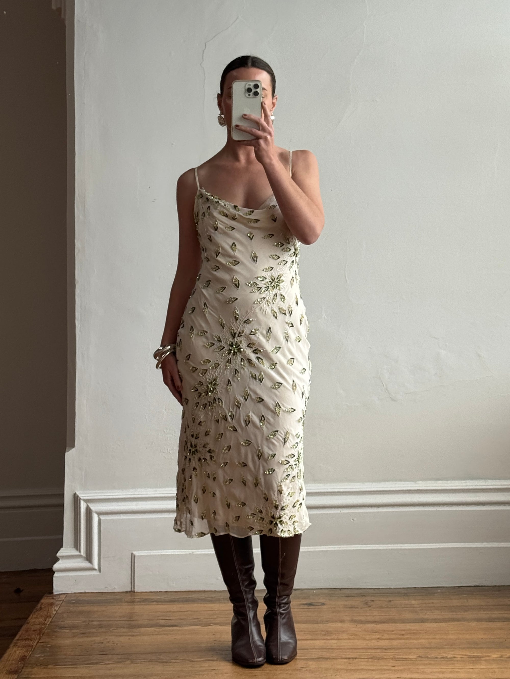 Vintage 90s Pure Silk Sequin Party Dress Creme