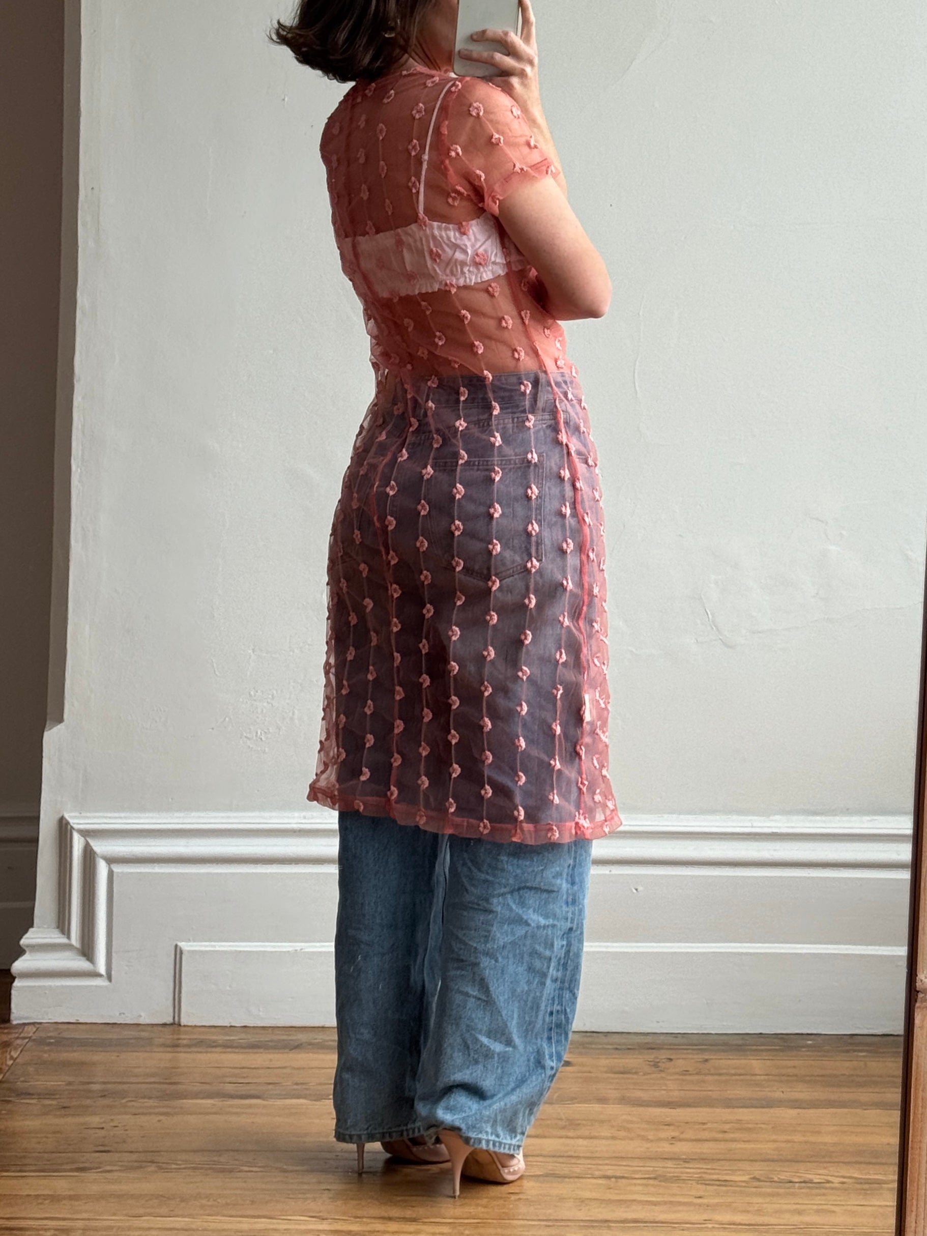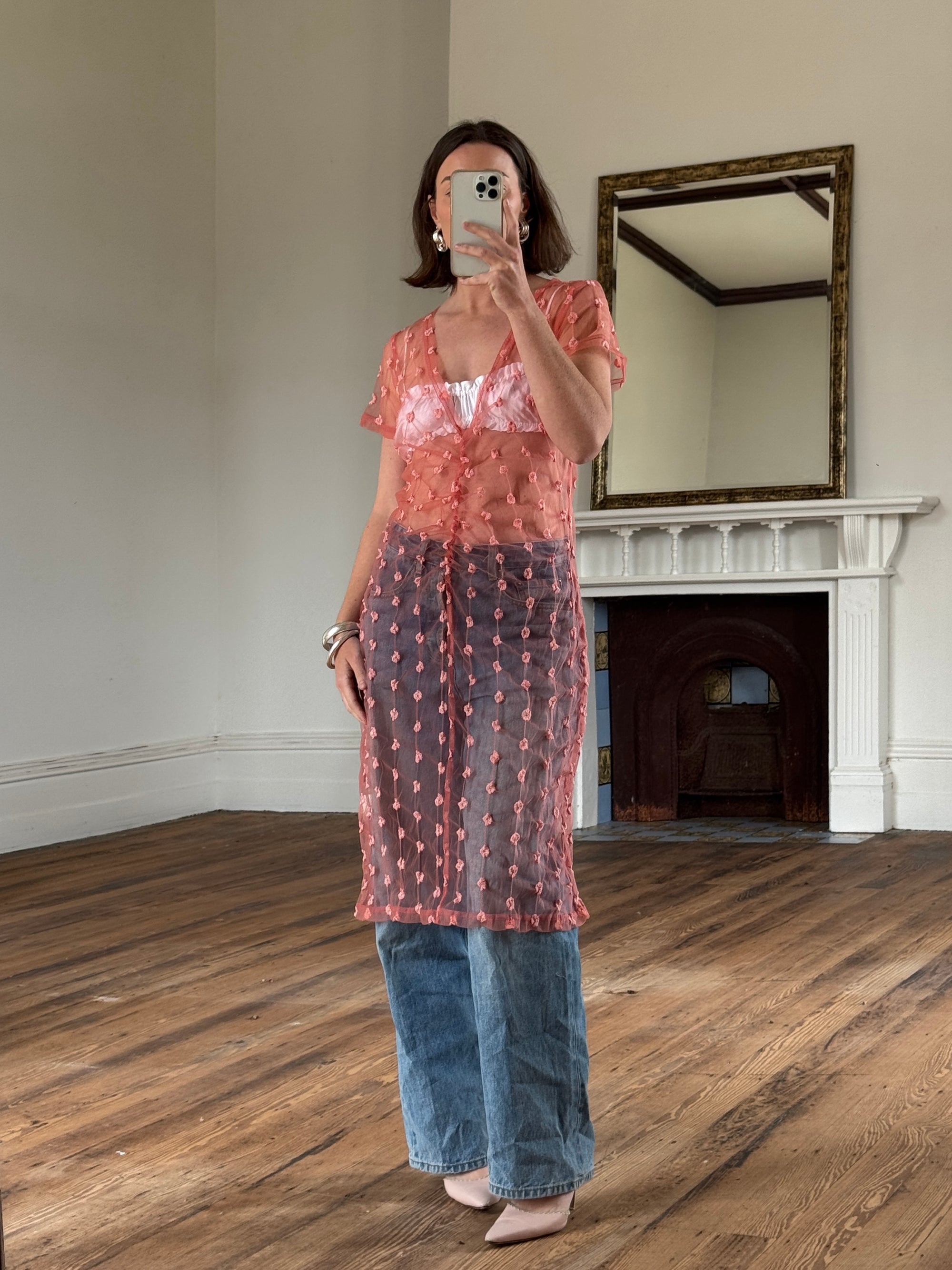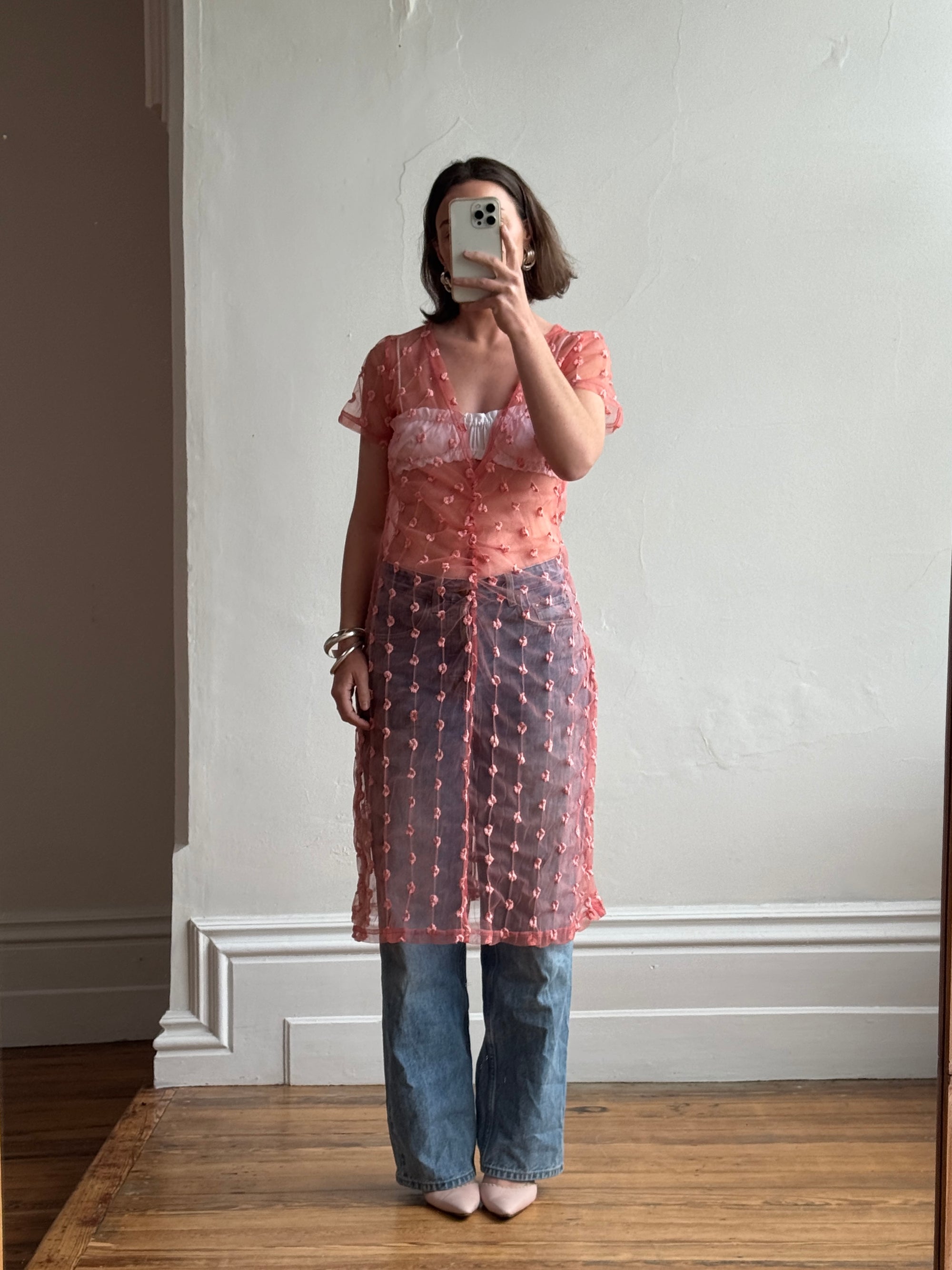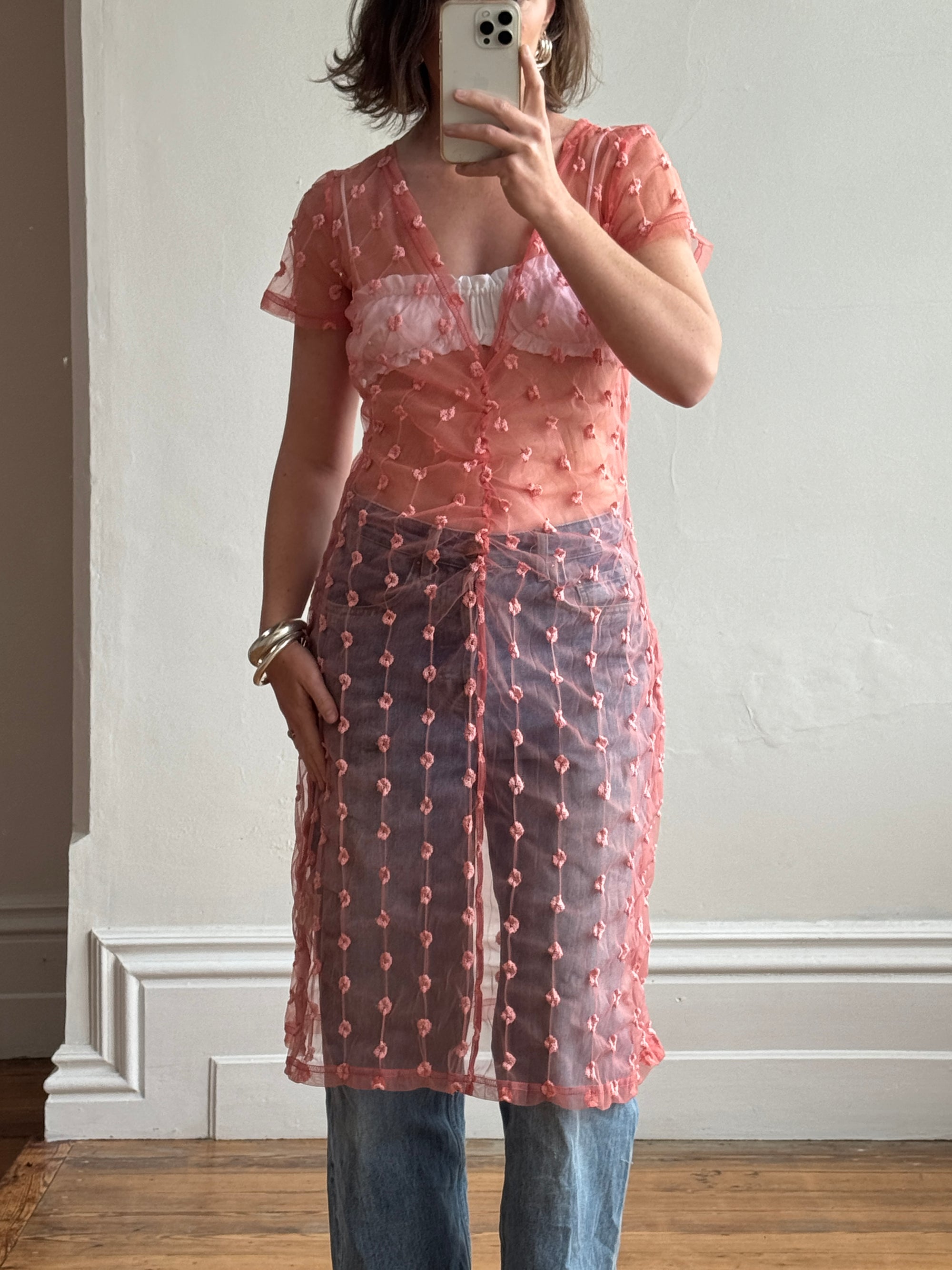 Vintage Y2K Sheer Ruched Mesh Dress Coral
