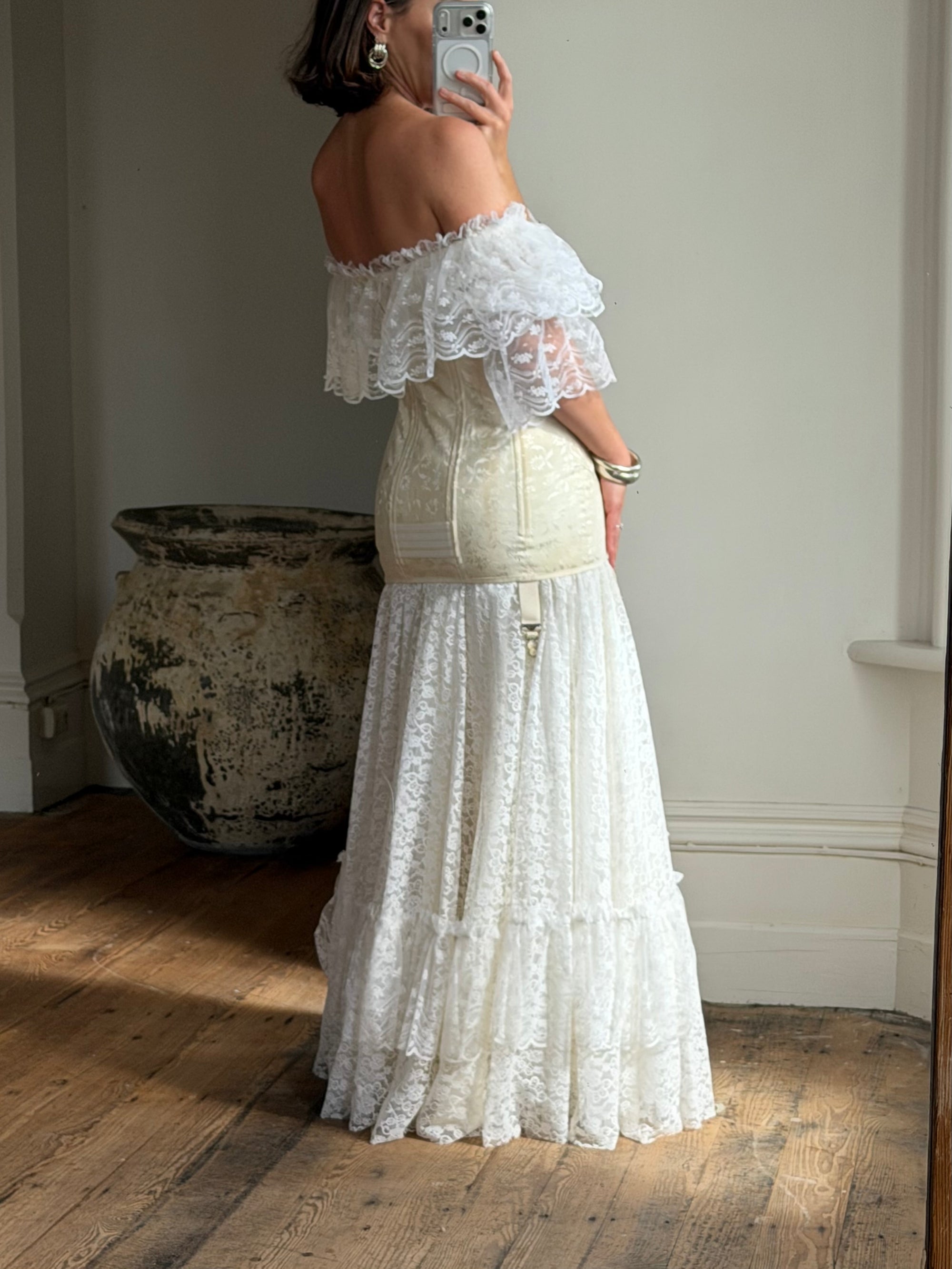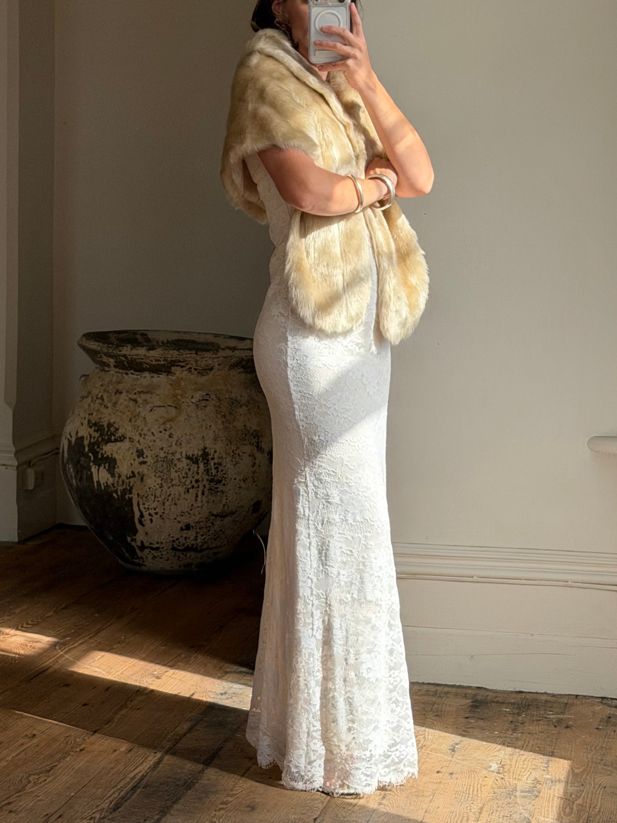 Vintage 40s Sheer Lace Bias Wedding Dress Creme