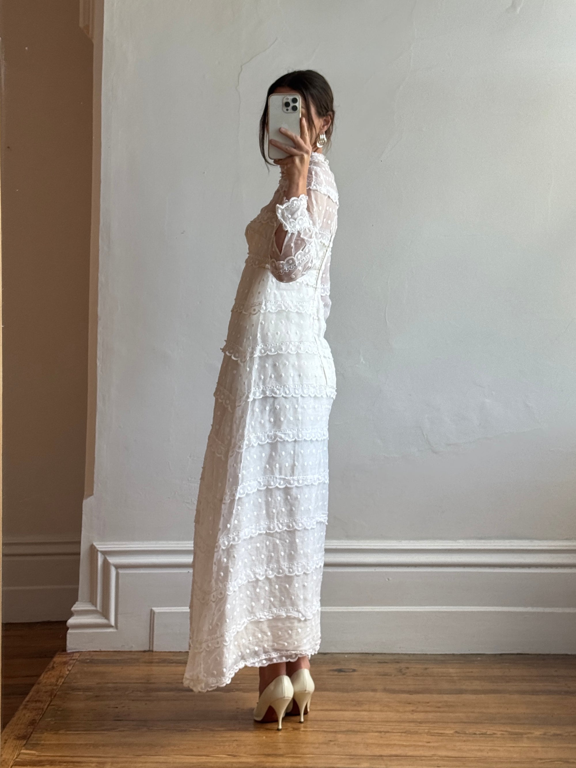 Vintage 60s Tiered Waterfall Wedding Dress Creme