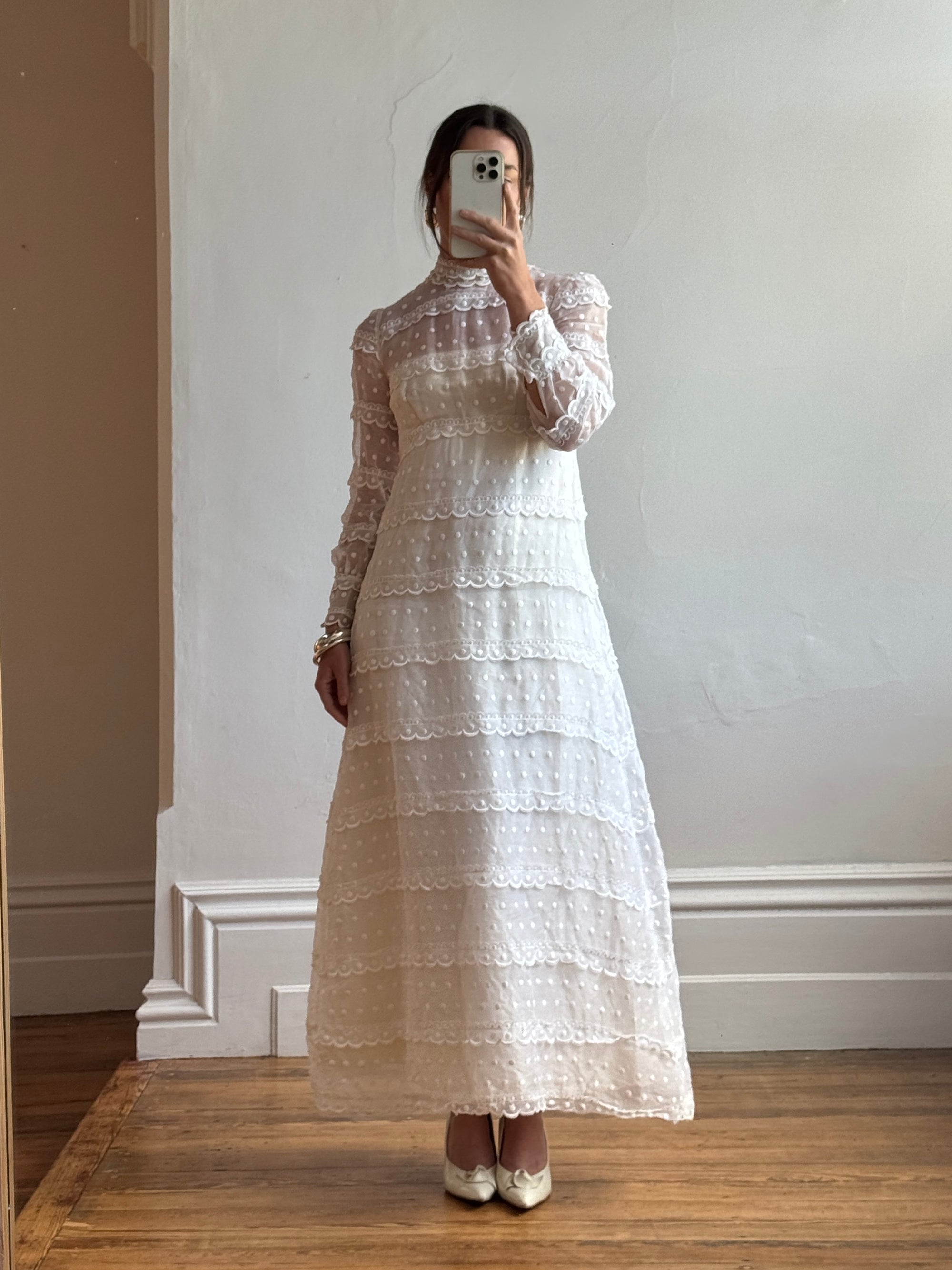 Vintage 70s Broderie Anglaise Frill Wedding Dress Ivory