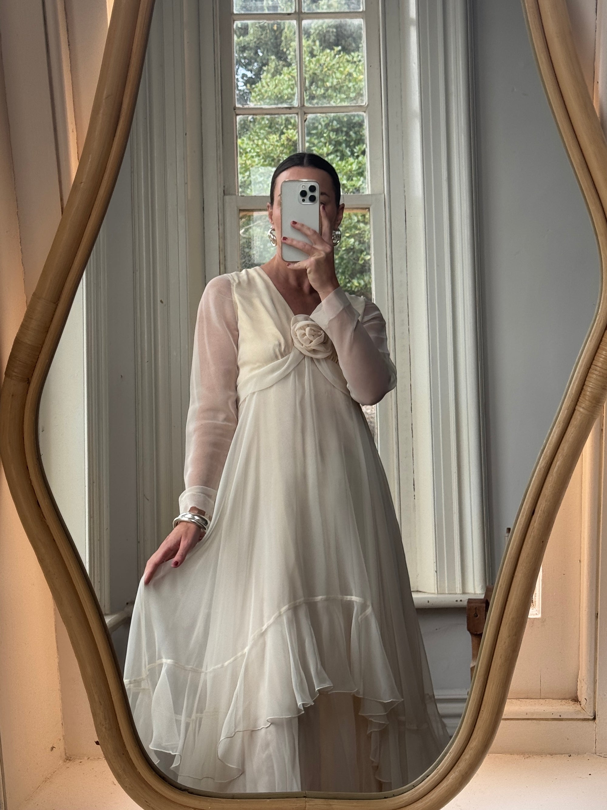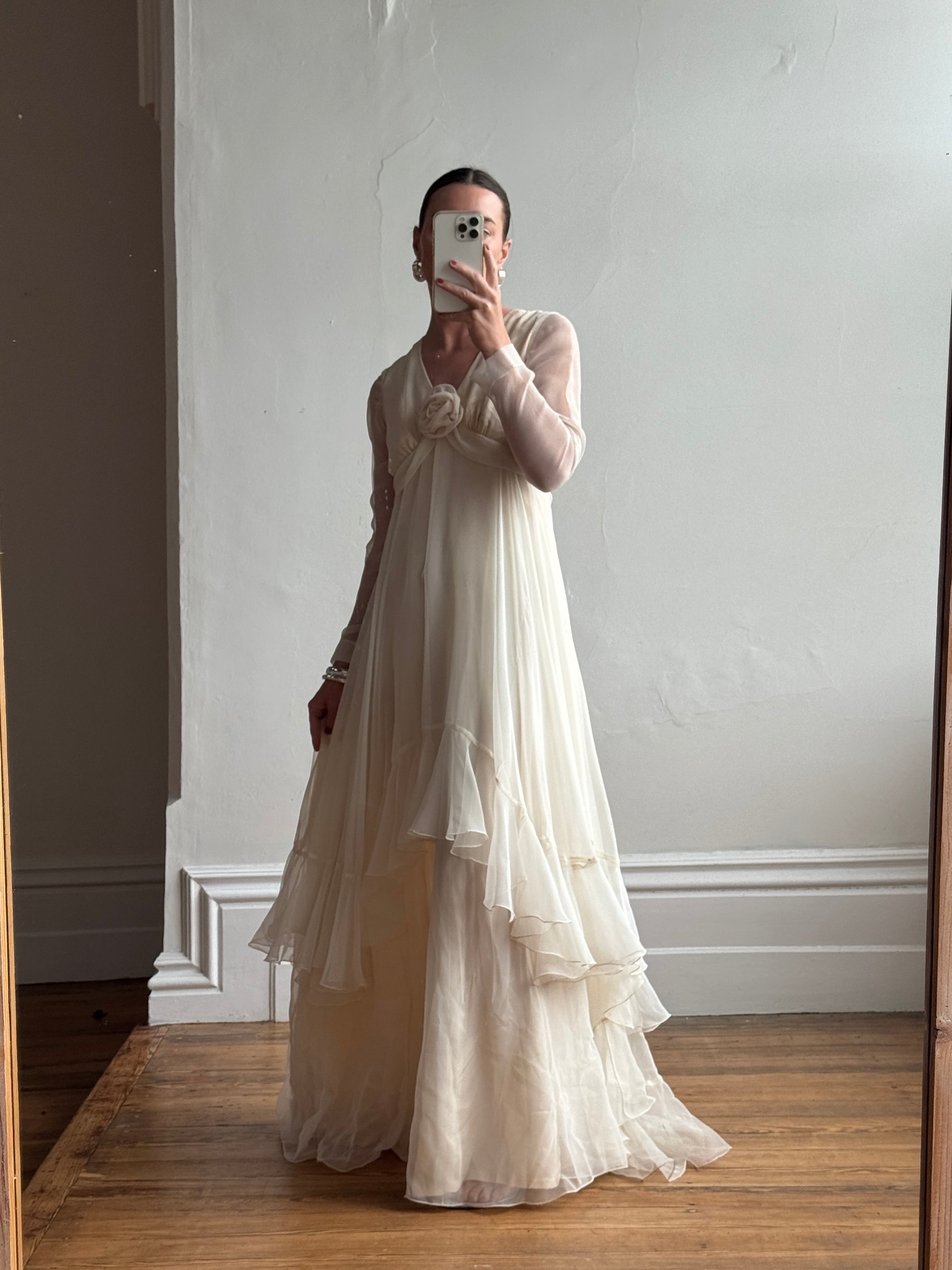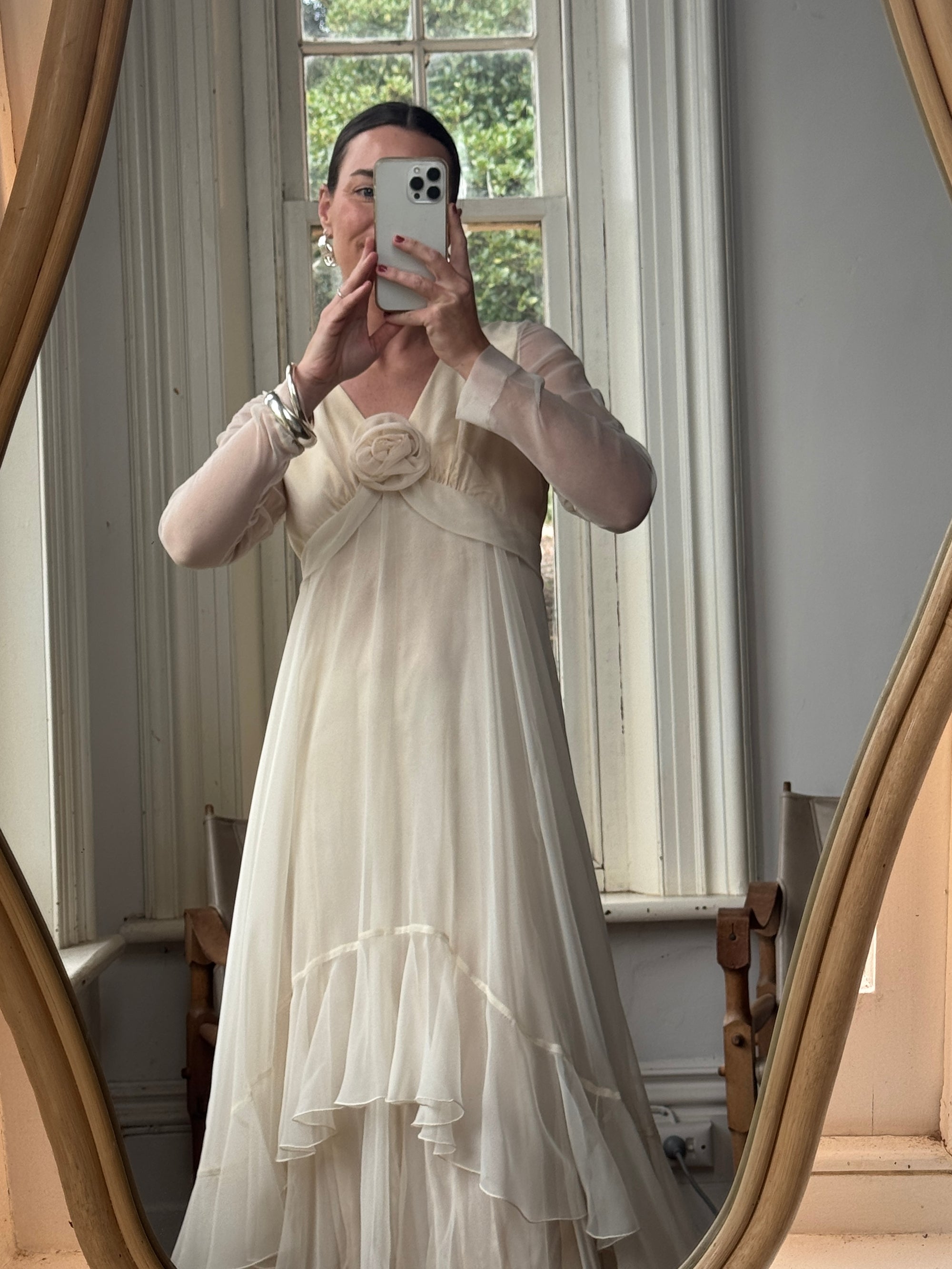 Vintage 70s Chiffon Rosette Wedding Dress Creme