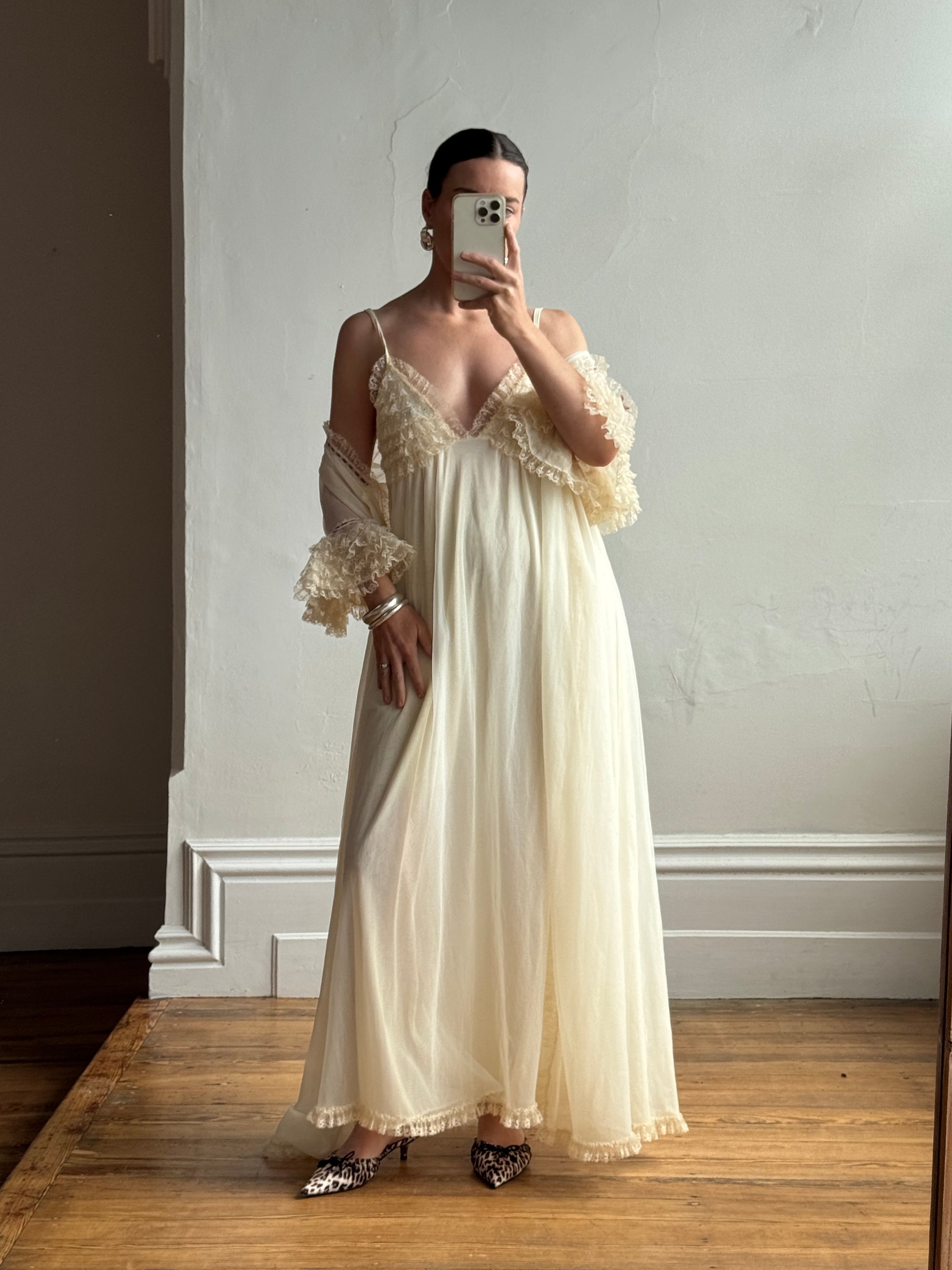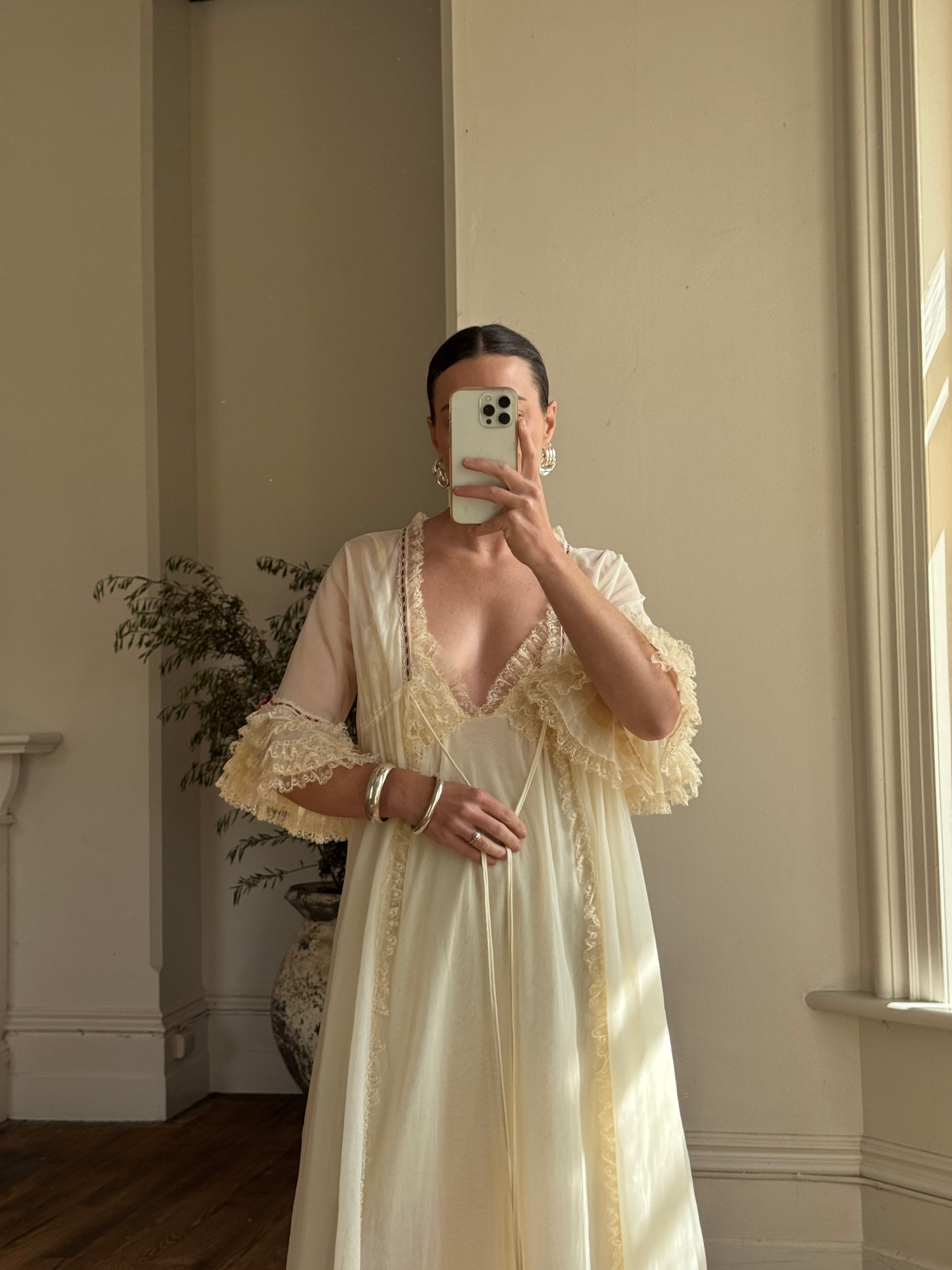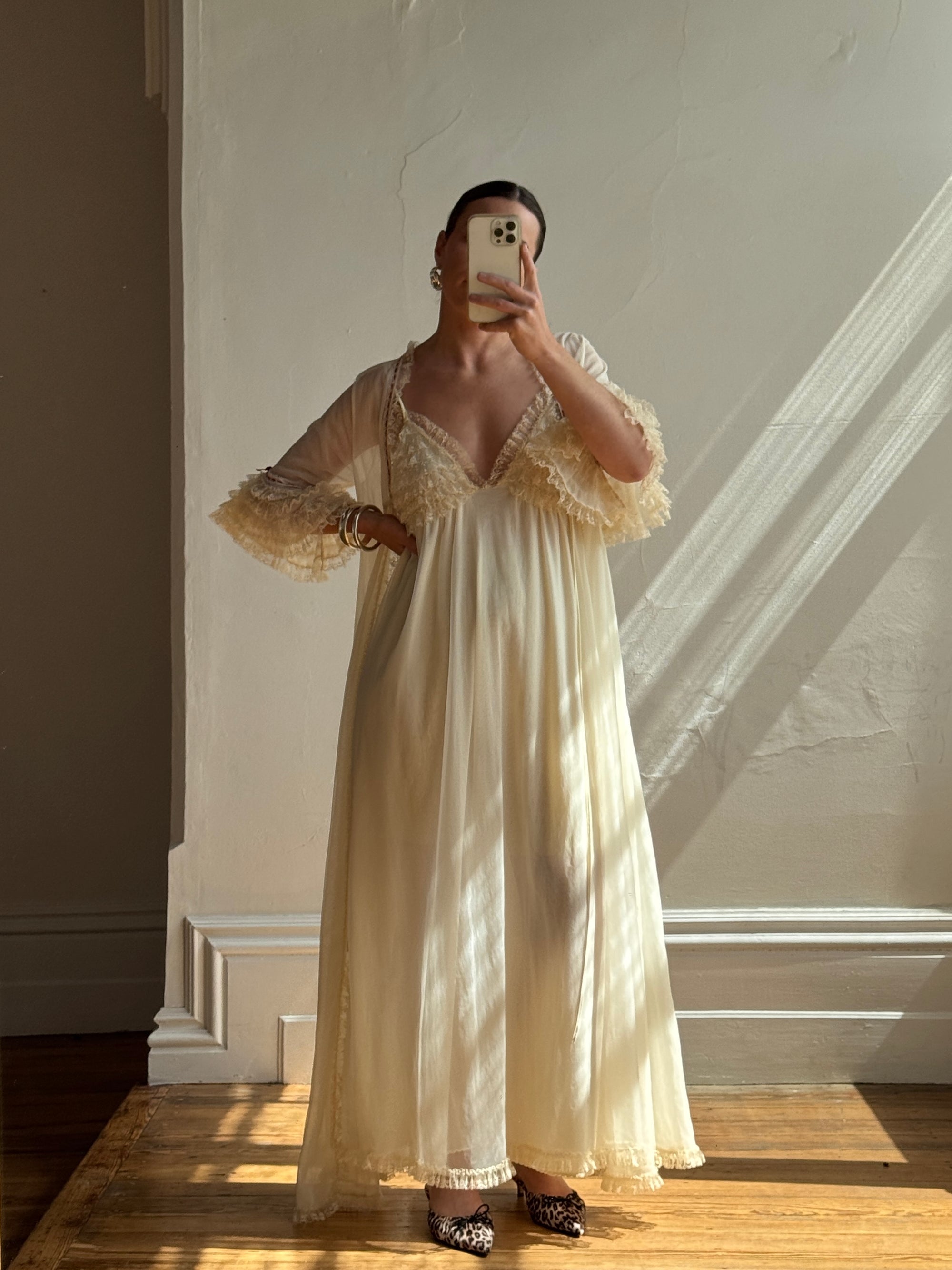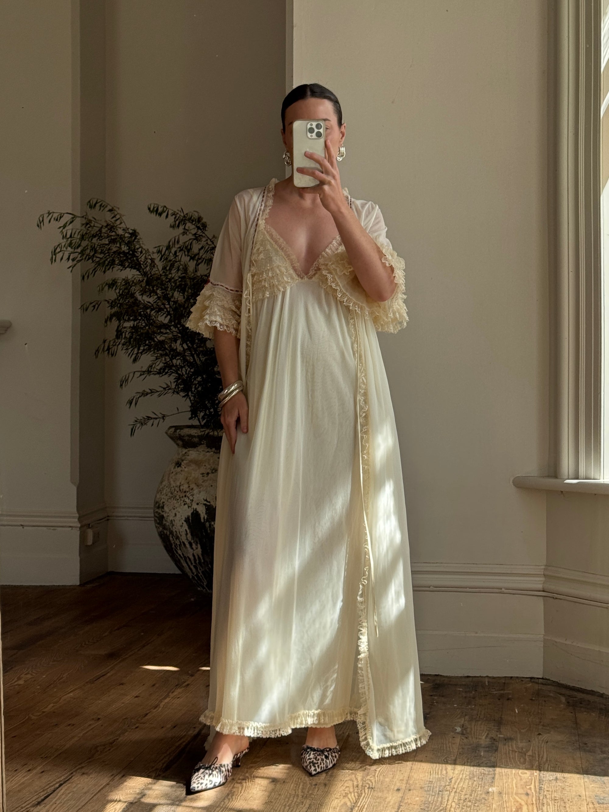 Vintage 70s Pure Silk Peignoir and Slip Butterscotch