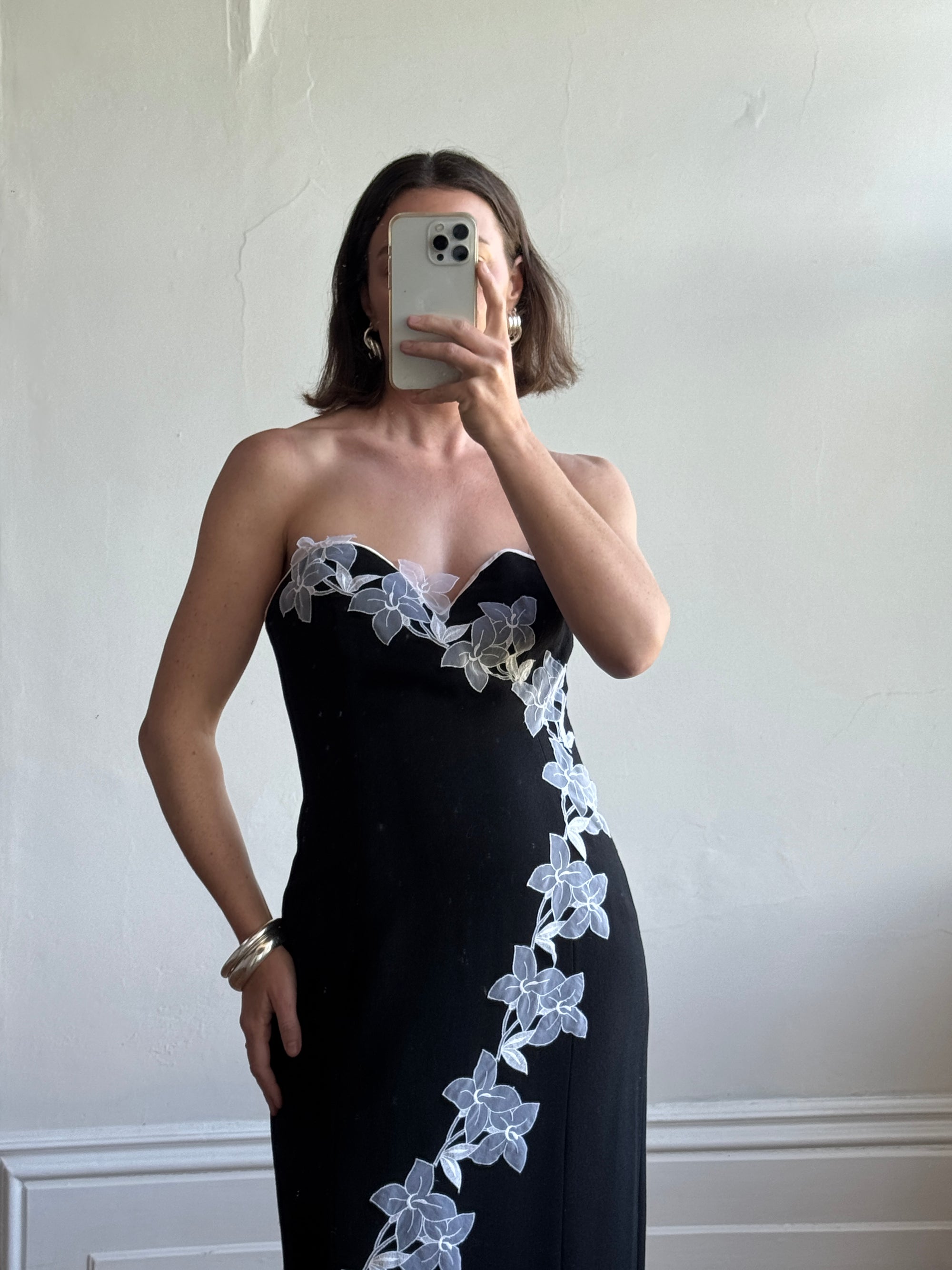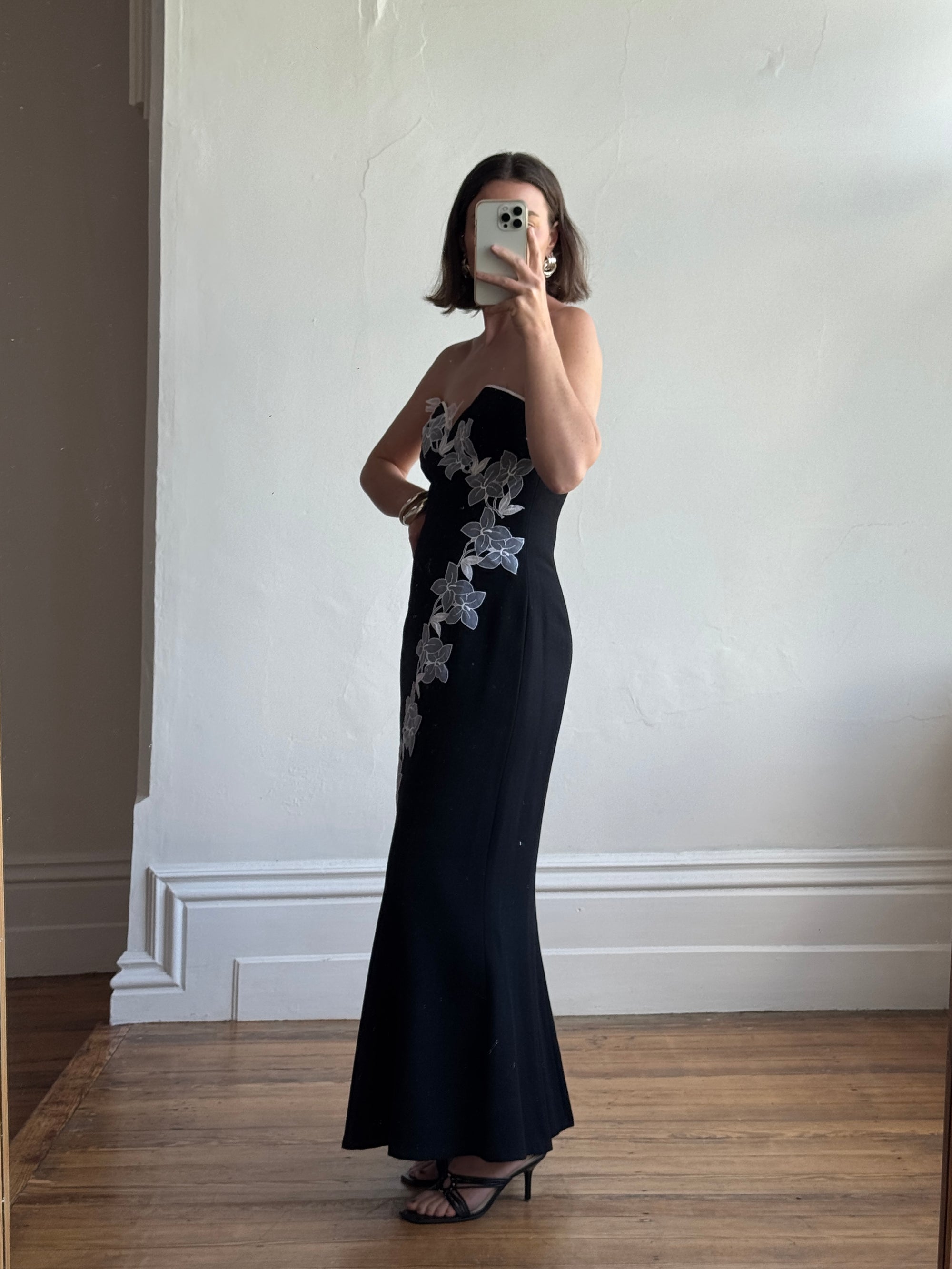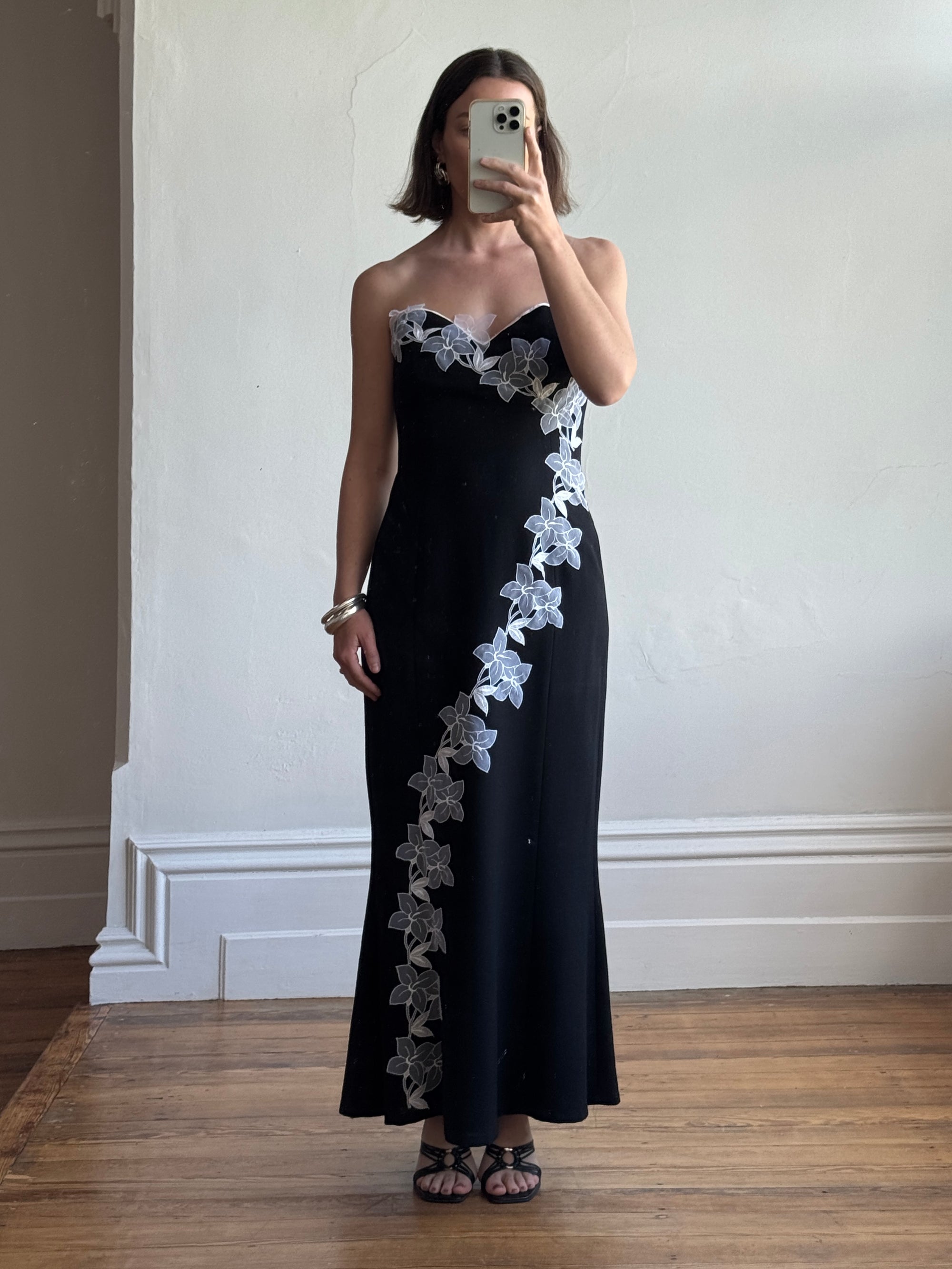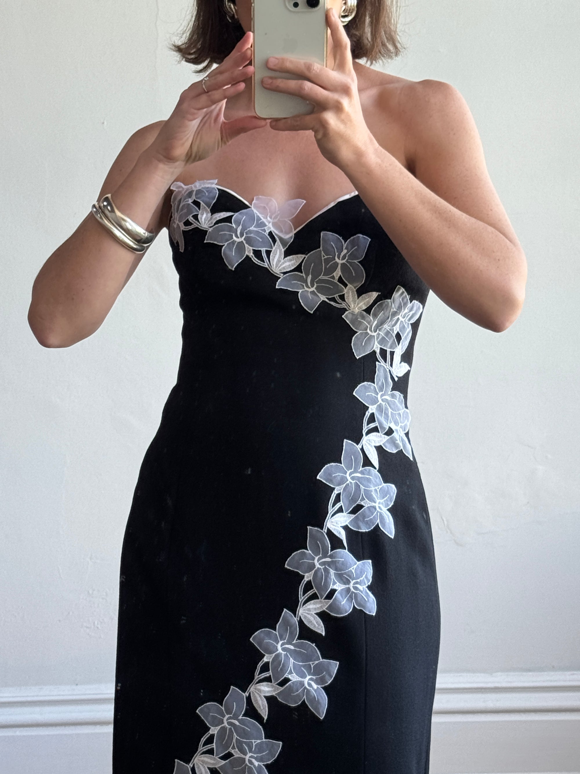 Vintage 90s Black Mermaid Dress with White Organza Flower Applique