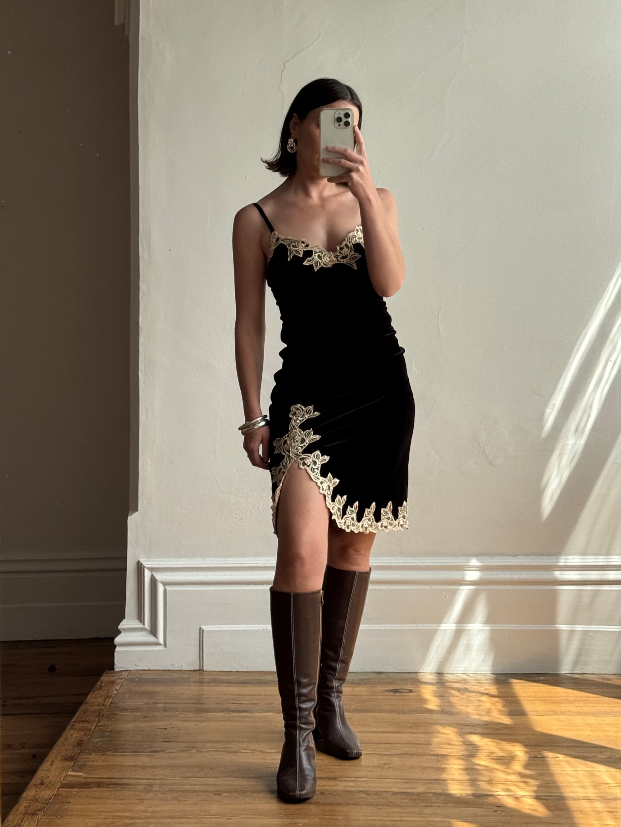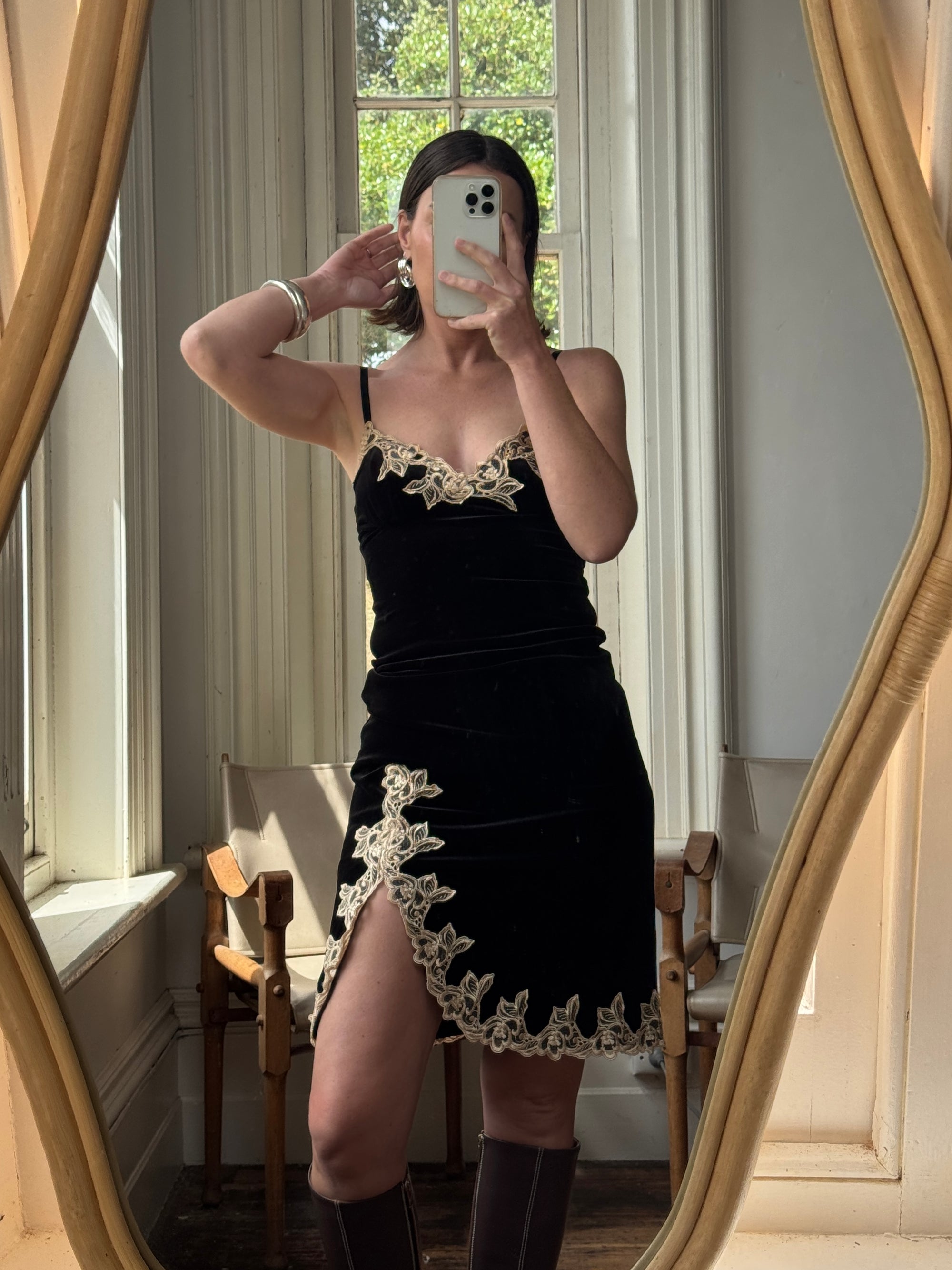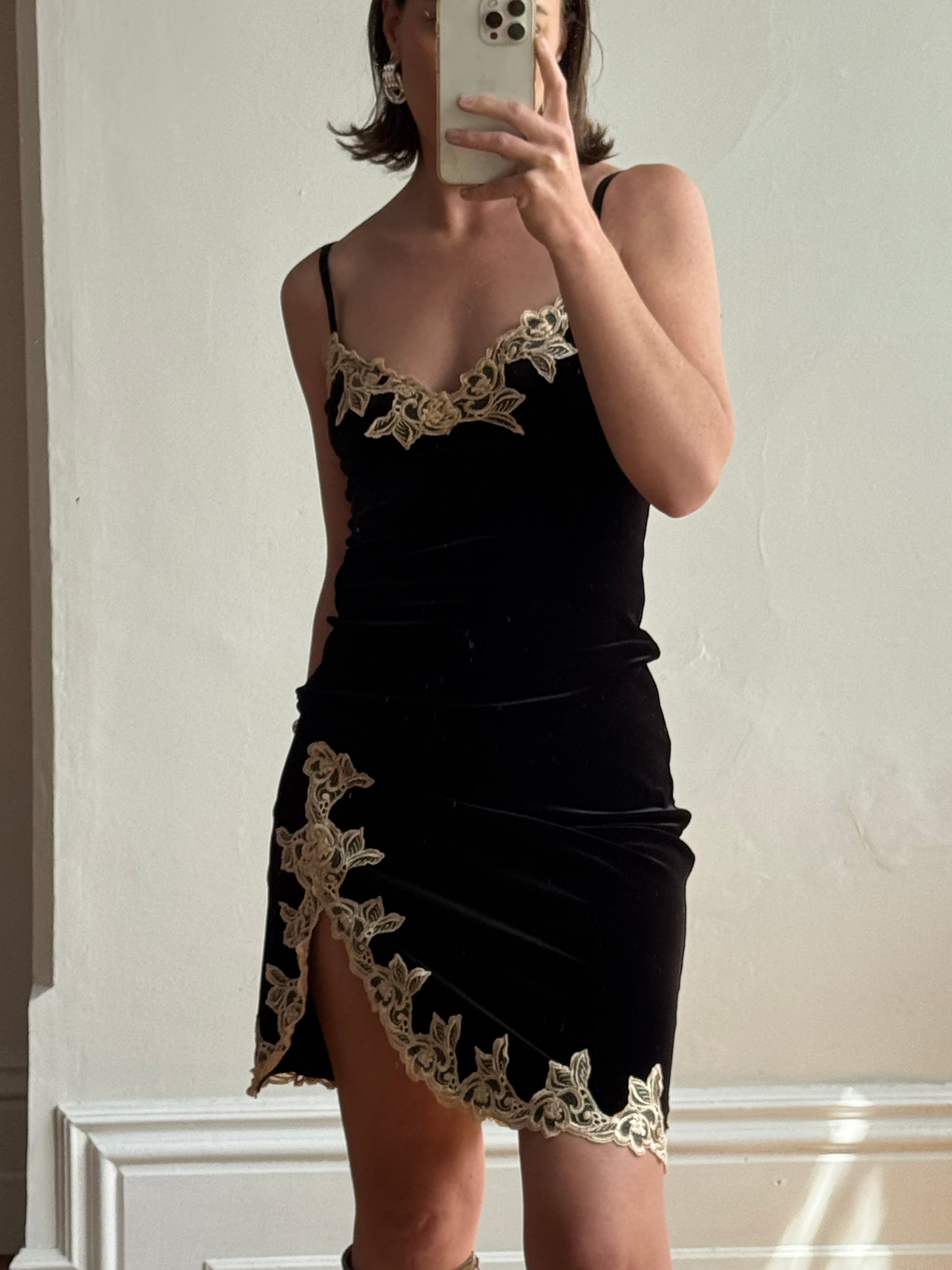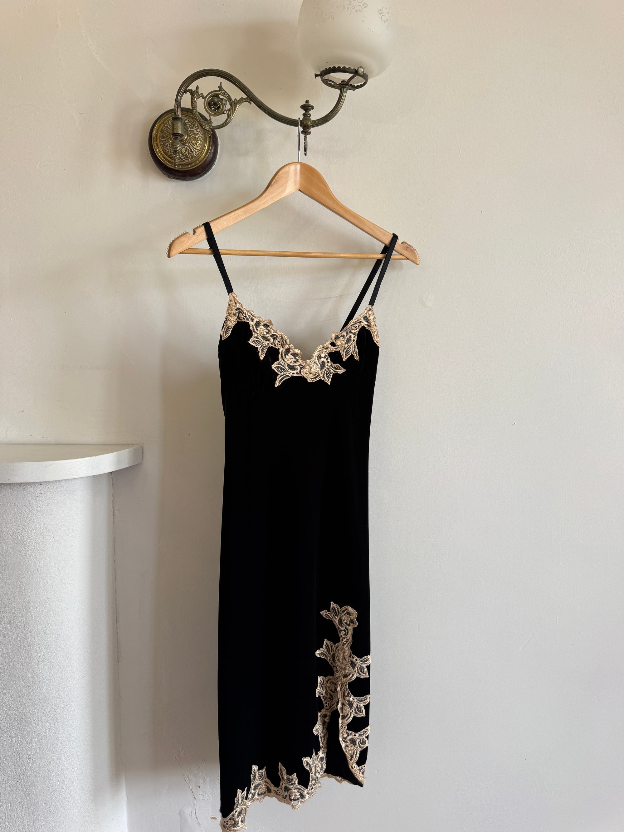 Vintage 90s Australian Made Velvet Lace Side Split Dress Creme Noir