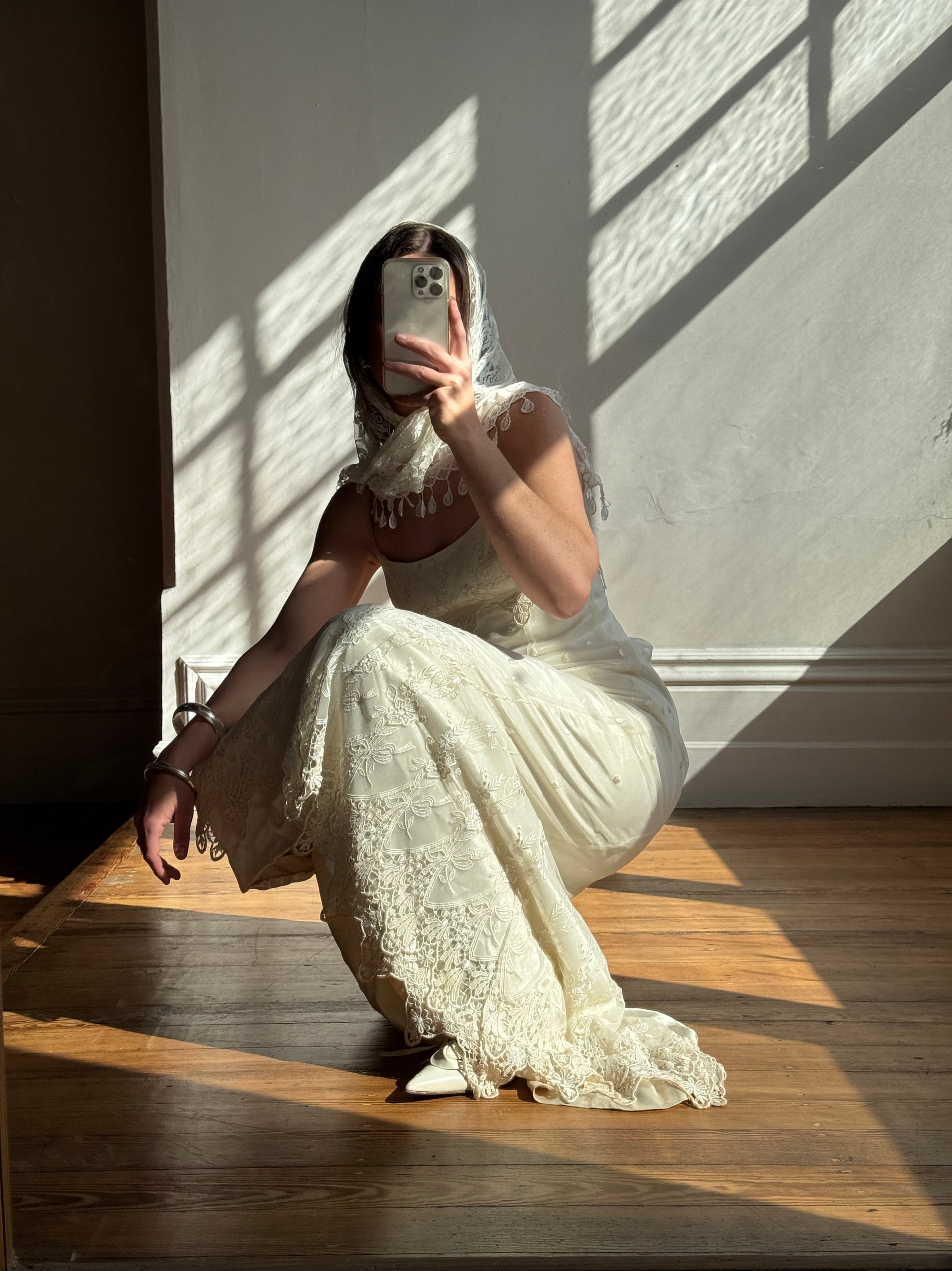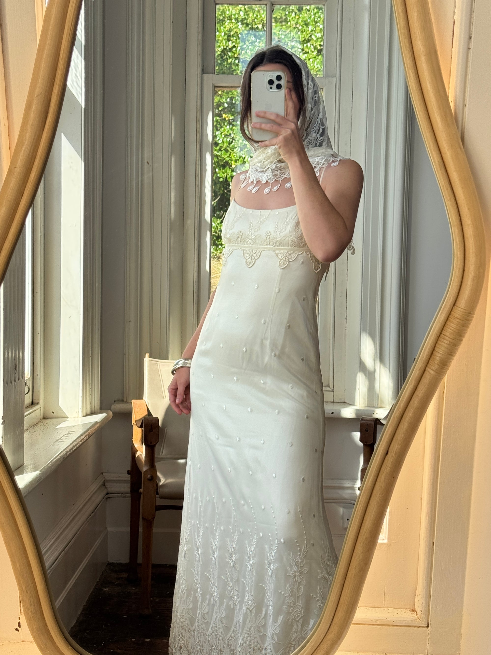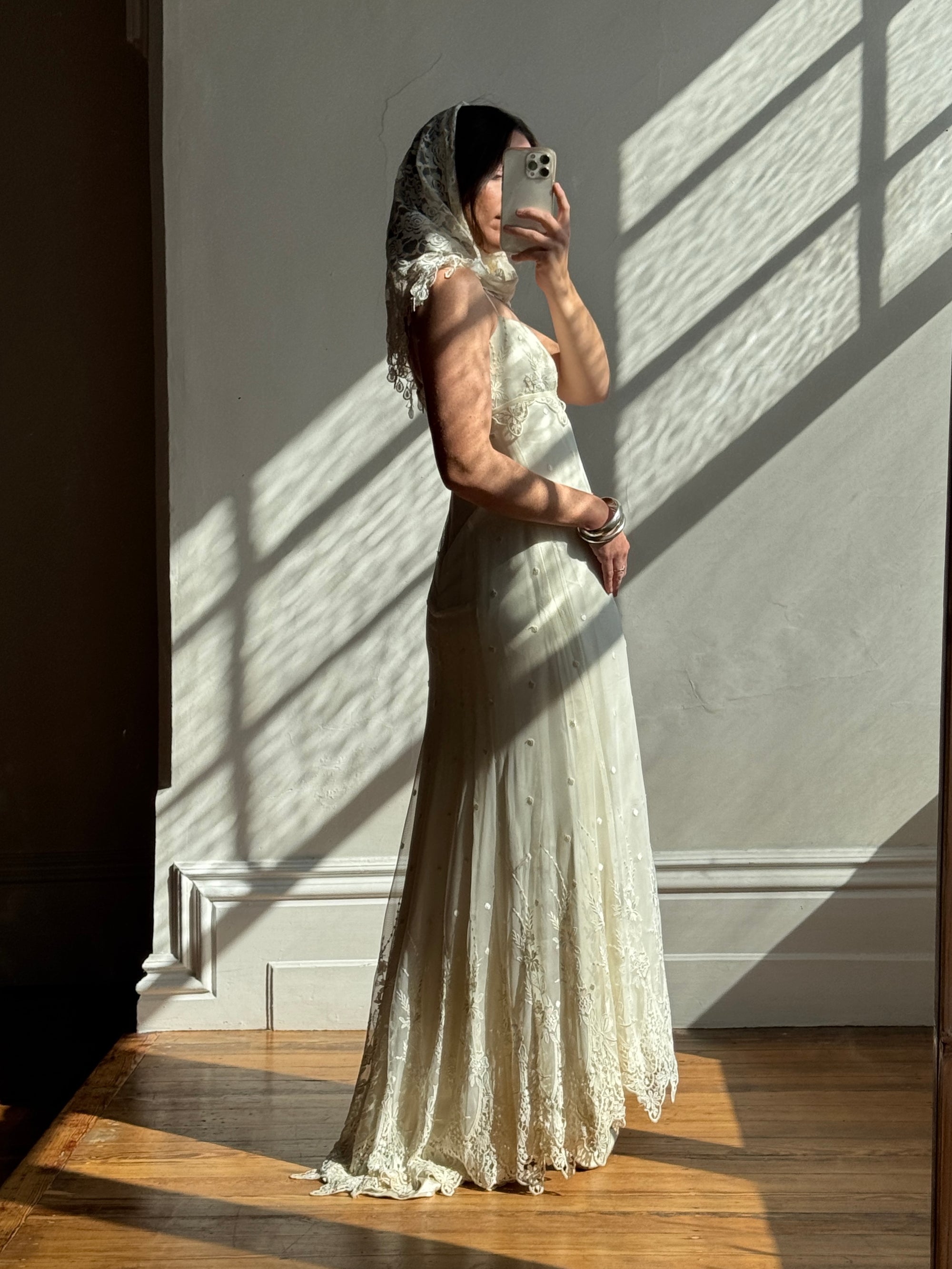 Vintage 90s Boho Lace Net Empire Wedding Dress
