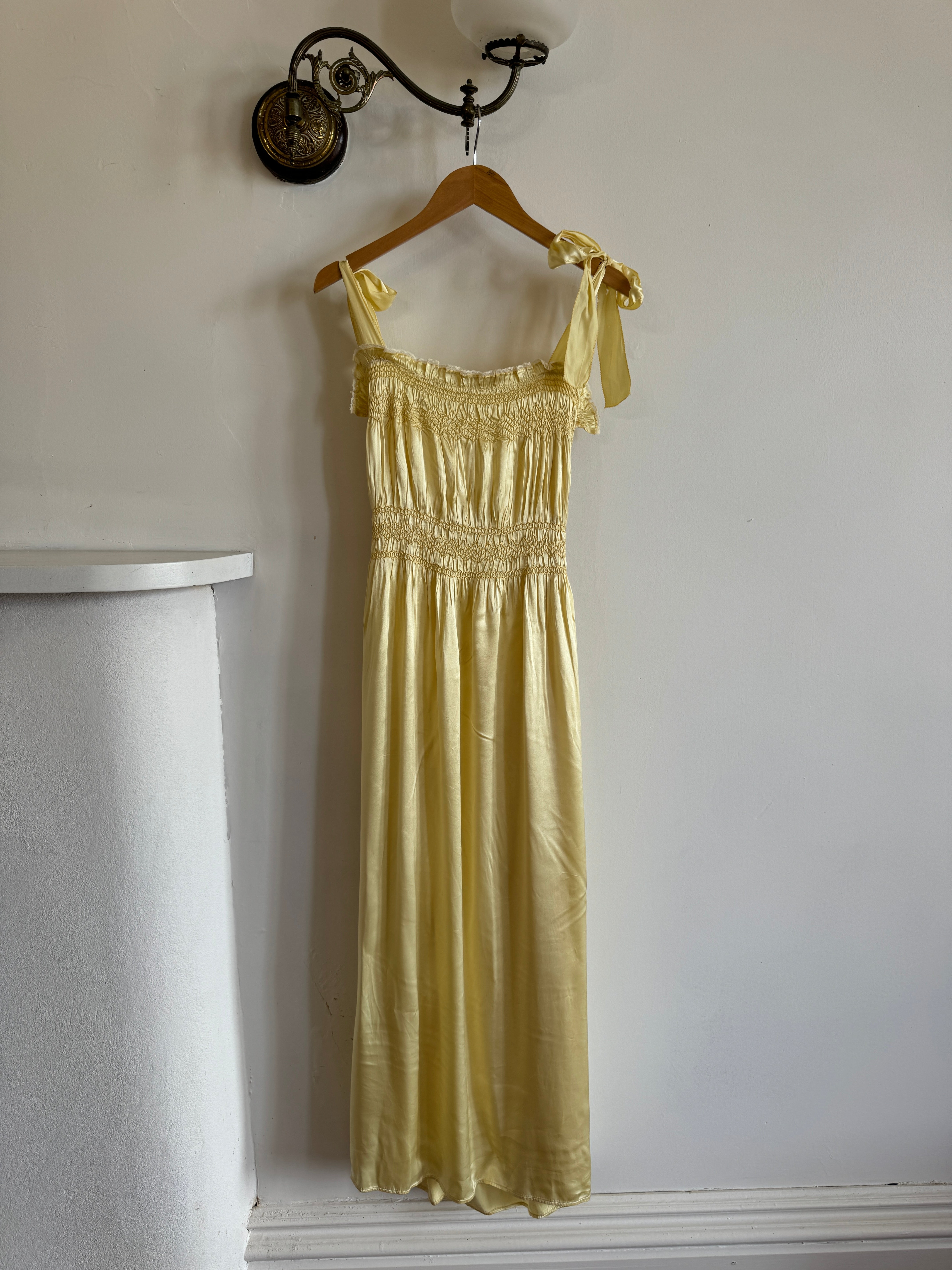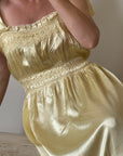 Vintage 40s Liquid Satin Shirred Dress With Ribbon Ties Yellow
